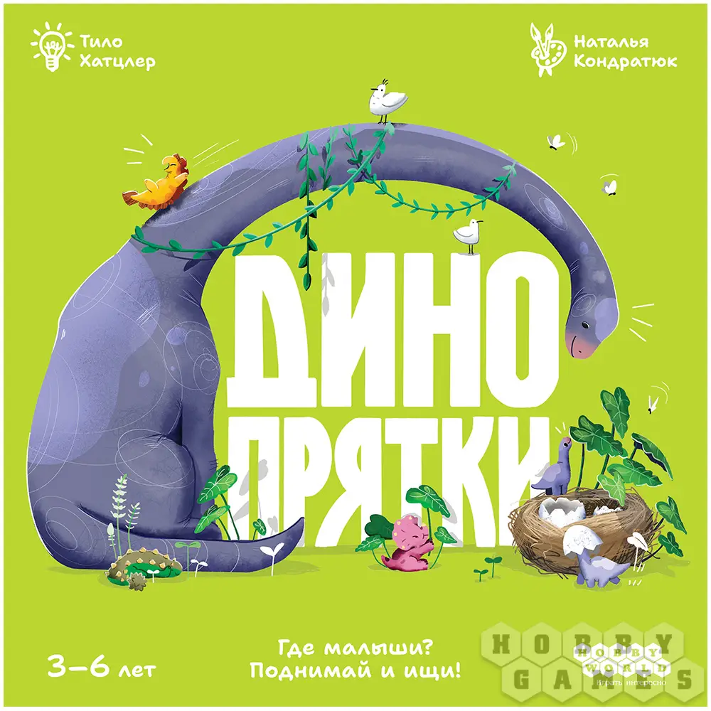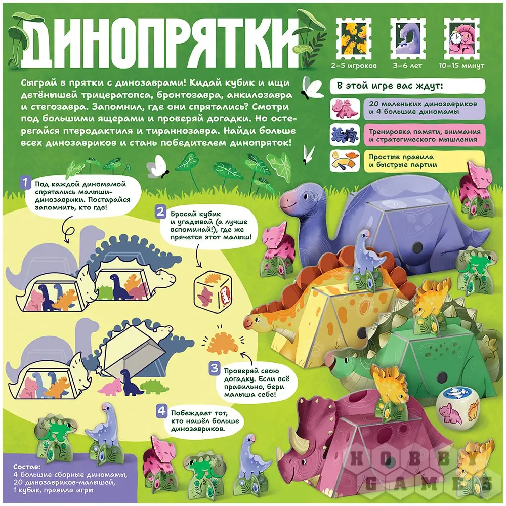 "Динопрятки" – это очаровательная игра для самых маленьких настольщиков и их родителей. В красочной коробке вас ждут четыре сборные трёхмерные диномамы, разноцветных динозаврики разных видов, а также большой удобный кубик. Простые правила и короткие партии идеально подходят для первого знакомства с настольными играми. Игра развивает память, внимание, зрительное восприятие и умение следить за действиями других игроков!