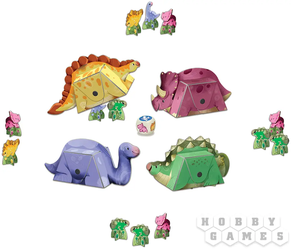 Подготовка к игре – это уже настоящее приключение! Соберите четырёх объёмных диномам, разместите их на столе и спрячьте под каждой по пять случайных динозавриков. Первым ходит тот, кто последним смотрел мультфильм про динозавров! Игроки по очереди бросают кубик, и в зависимости от результата выполняют одно из трёх действий: