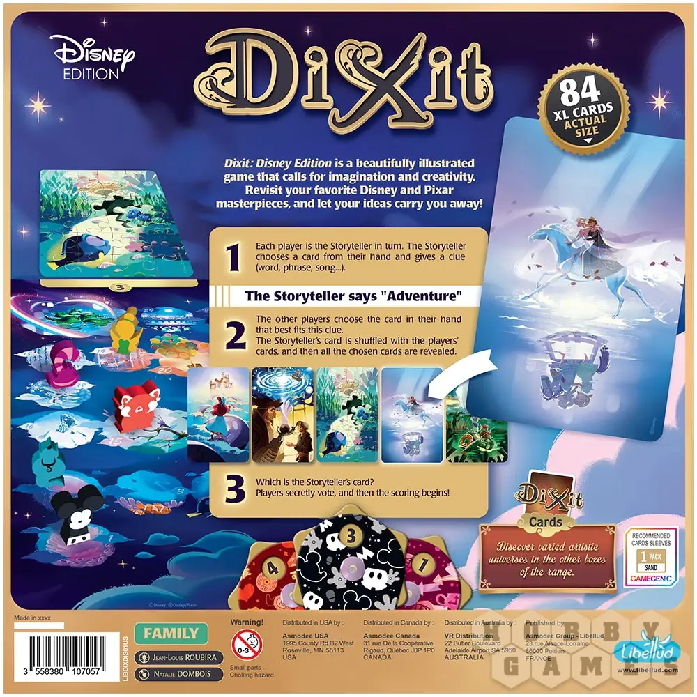 "Диксит" – настольная игра, в которой игроки общаются через карты с сюрреалистическими иллюстрациями, каждая из которых может быть интерпретирована по-разному. В игре участвуют 84 карты, дающие множество вариантов для ассоциаций и толкований. В этой версии игры вы погружаетесь в мир Disney, где изображения на картах связаны с классическими мультфильмами студии.