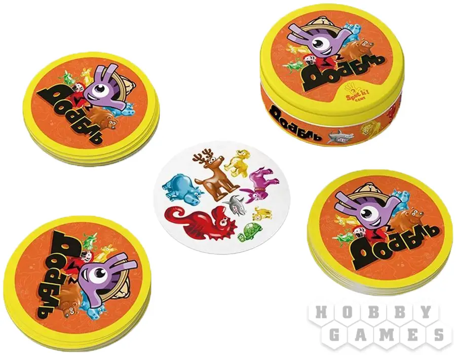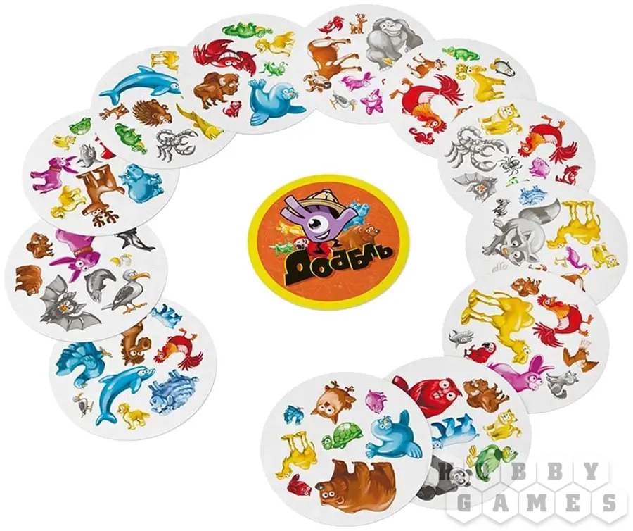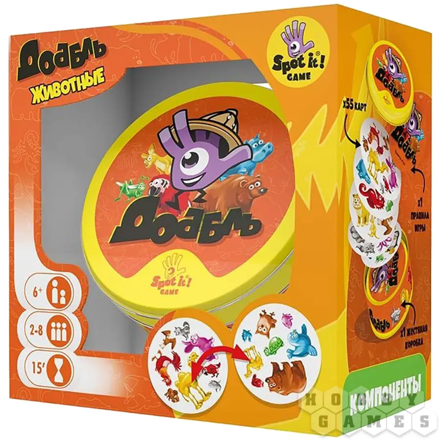 "Доббль: Животные" – это простая, весёлая и азартная игра на внимательность и скорость реакции, которая претерпела уже не одну итерацию, и всё ещё остаётся популярной настолкой! Как бы ни менялось оформление игры "Доббль", в основе её лежит всегда один и тот же принцип – найти на двух разных карточках совпадения быстрее остальных игроков. Именно за эту простоту правил игра и обрела широкую популярность. Посудите сами: легко объяснить детям, ещё и помогает развить внимательность и реакцию, а соревновательный дух поддерживает азарт в каждом игроке. Как можно понять из названия, в этой версии игры вам предстоит искать на карточках совпадающих животных. Нашли двух медведей? Кричите! И пусть победит внимательнейший!