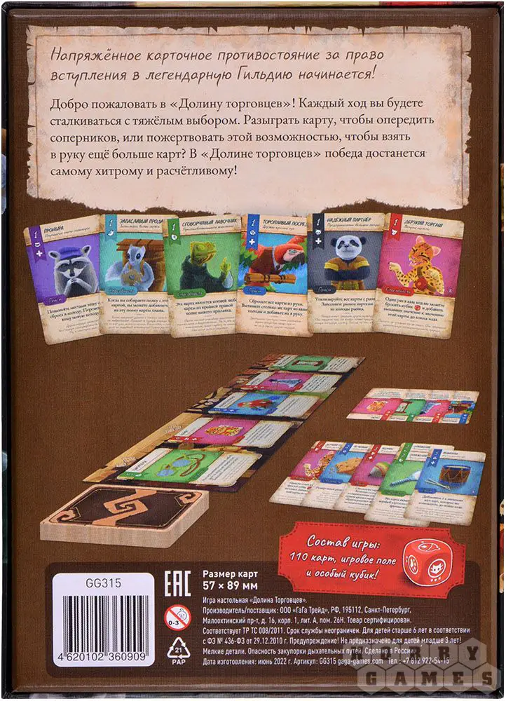 В игре "Долина торговцев" вы возьмёте роли купцов, что соревнуются за право вступить в гильдию. Под вашим началом окажутся торговцы шести разных народов: приспосабливающиеся хамелеоны, предприимчивые панды, плутоватые еноты-полоскуны, дерзкие ара, запасливые белки-летяги и везучие оцелоты! Каждый из них ведёт дела в своей манере: одни полагаются на красноречие и деловую хватку, другие – на уловки и подлости. На старте всё, что у вас есть – скромный прилавок, небольшой запас особых приёмов вашего народа и природное обаяние. Цель – собрать на своём прилавке 8 полок, прежде чем это сделают другие торговцы.