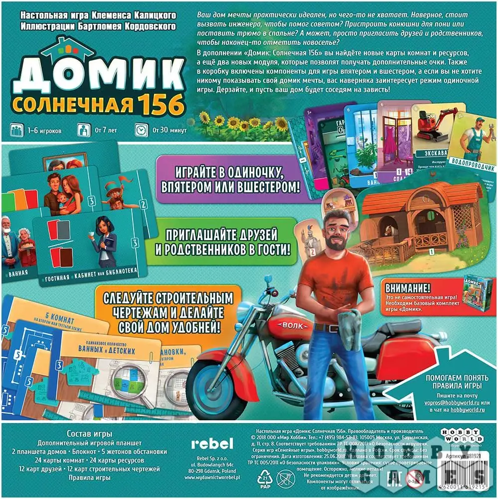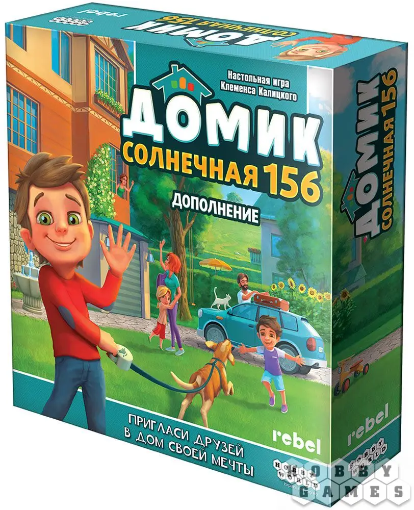"Домик. Солнечная 156" – это дополнение для милой и уютной настольной игры, в котором игроки занимаются проектированием домиков своей мечты, а также их интерьером. Дополнение привносит много нового и интересного, позволяет играть большим количеством человек, добавляет новые карты и т. д.