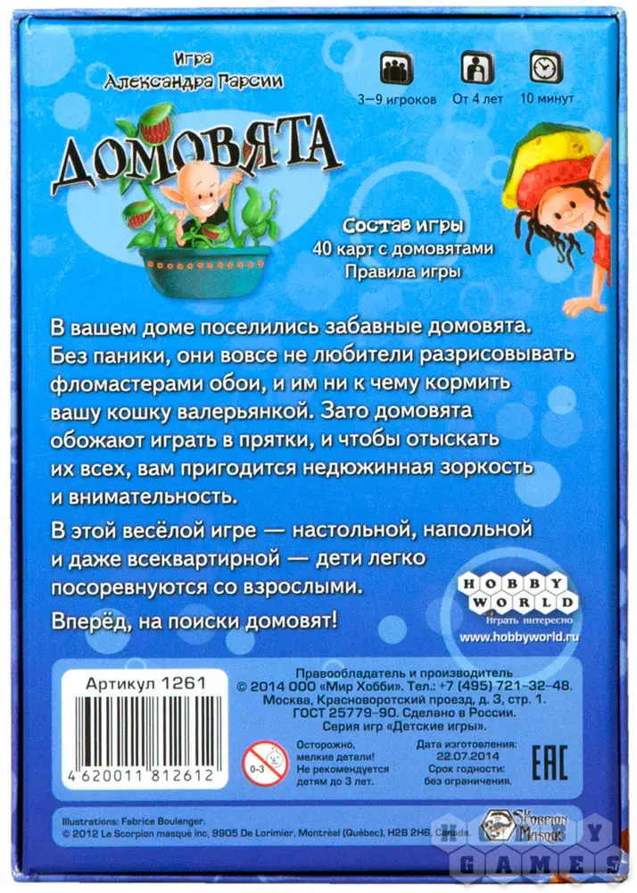 Самое интересное, что играть в эту игру надо по всей квартире! Можно играть как в вариант «холодно-горячо», по очереди пряча домовят в одной комнате, так и взять каждому по комнате, а потом попытаться найти домовят без подсказки. Для большего интереса можно даже добавить в игру специальных домовят-проказников, которых надо хорошенько искать, иначе они утащат ваши выигрышные карты!