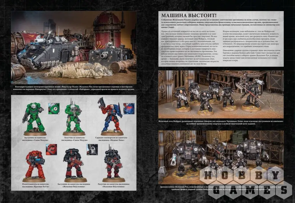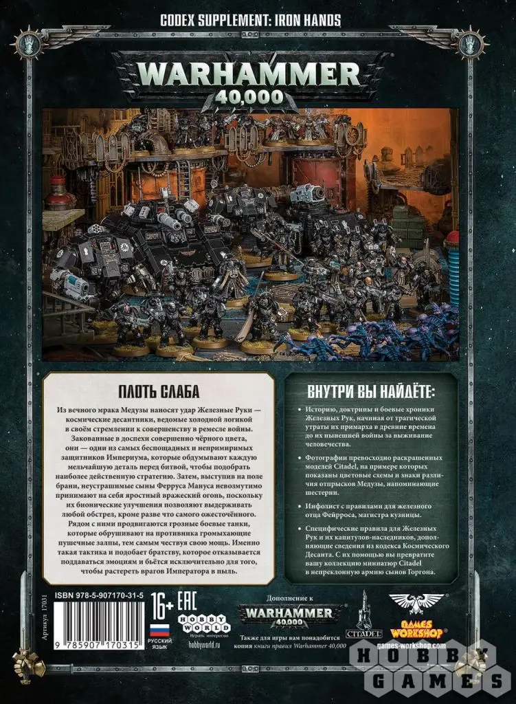 Железные Руки (Iron Hands) обрели единение с машиной. Они являются самыми стойкими и неустанными из всех Адептус Астартес и готовы показать превосходство своей аугметики в битвы, доказывая тем самым, что плоть слаба. В этом приложении к кодексу Космического Десанта шестьдесят четыре страницы, на которых находится всё, что вам необходимо для раскрытия потенциала Железных Рук в бою, а также захватывающие истории и иллюстрации, которые вдохновят вас на создание собственной коллекции.