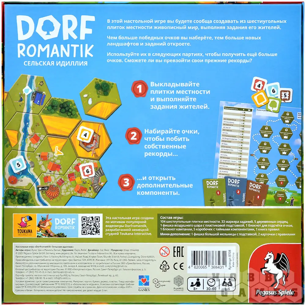 "Dorfromantik: Сельская Идиллия" – это настольная кооперативная игра, в которой участникам предстоит создавать красочные сельские пейзажи посредством размещения шестиугольные плиток. Главная цель всех игроков – выполнить пожелания жителей, построить самые длинные реки и протяжённые железнодорожные маршруты, а также учесть дополнительные условия, обозначенные на специальных флагах. Успешное выполнение задач приносит очки, которые накапливаются в рамках кампании (она доступна для повторного прохождения). Заработанные очки можно тратить на открытие особых коробочек, внутри которых содержатся новые игровые элементами. Эти дополнения вводят свежие задания, делая процесс ещё интереснее и расширяя горизонты возможностей!
