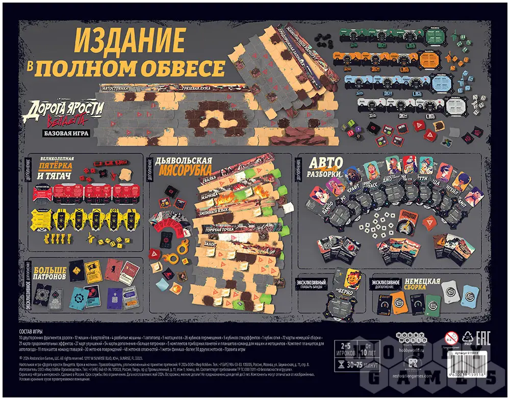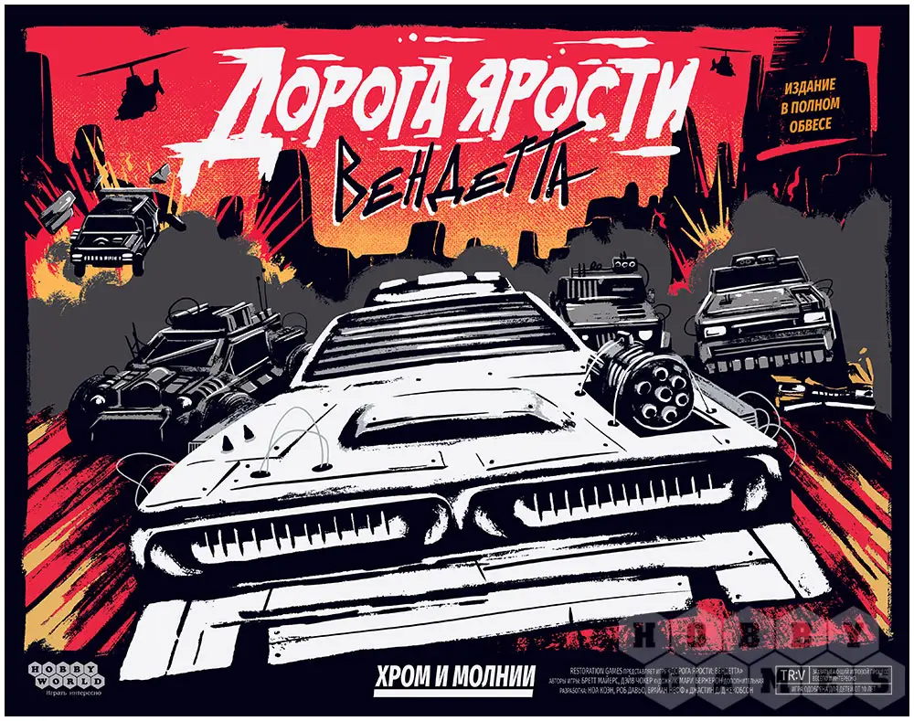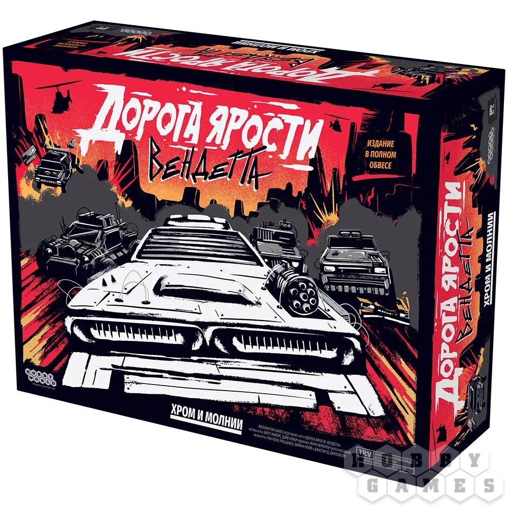 "Дорога Ярости: Вендетта. Хром и молнии" – это издание, которое объединяет в себе базу "Дорога Ярости: Вендетта" и целых 5 дополнений, из них 2 – эксклюзивные: "Авторазборки", "Дьявольская мясорубка", "Великолепная пятёрка и тягач", "Больше патронов", "Немецкая сборка". Также в комплекте идёт эксклюзивный главарь банды. Теперь вы сможете объединить особенности и препятствия всех дополнений на одной карте и в полной мере прочувствовать атмосферу ожесточённого заезда. Приготовьтесь покорять непредсказуемые трассы, уворачиваться от выстрелов и таранов банд-конкурентов, а также тщательно продумывать свой маршрут – ведь если не рассчитать скорость, можно спокойно вылететь в кювет и выбыть из гонки.