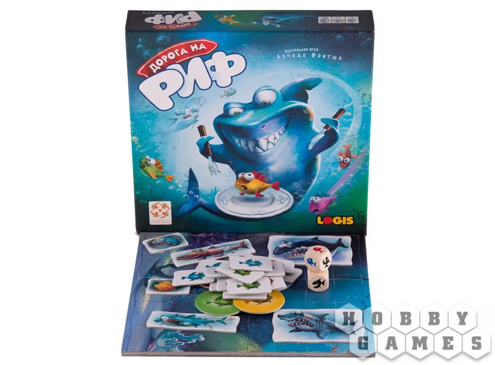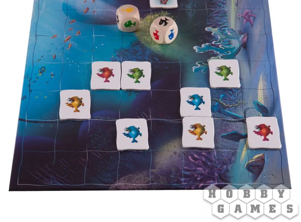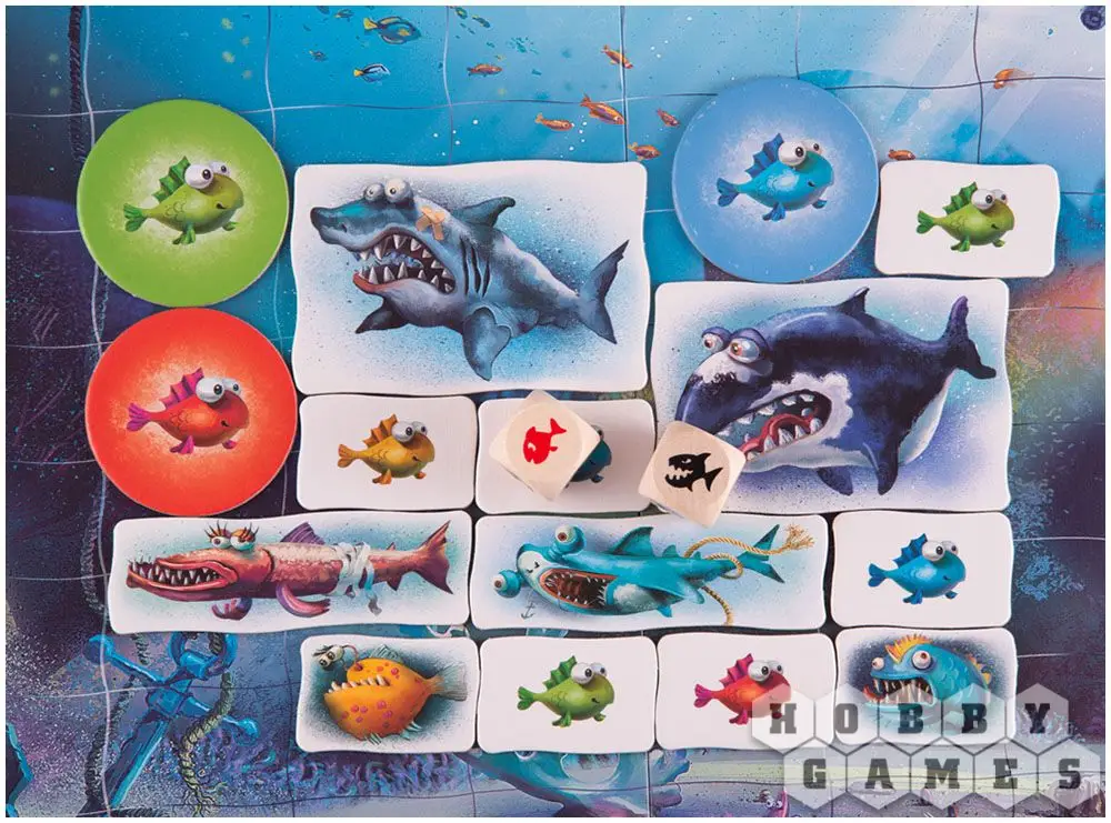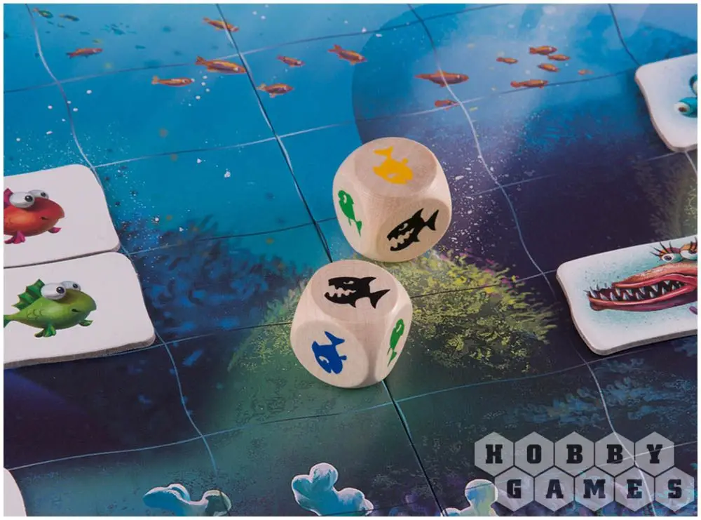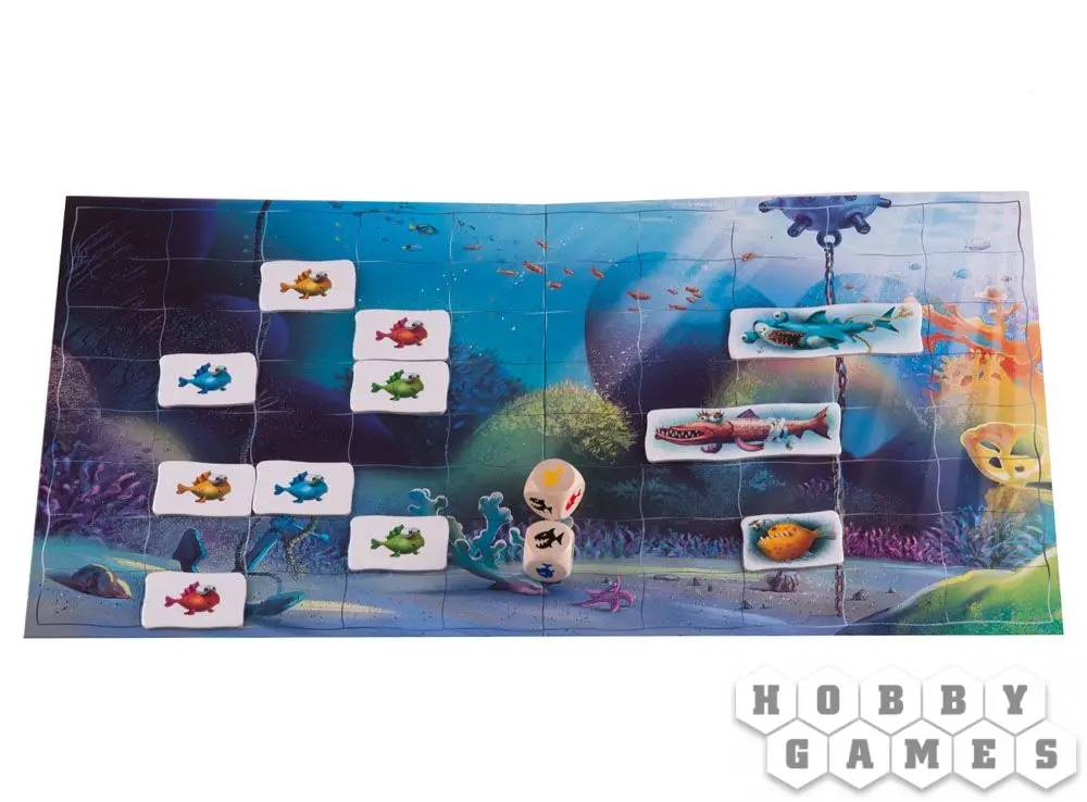 Разместите на игровом поле справа три любых хищных рыбы, а после выложите жетоны цветных маленьких рыбок на поле слева. По очереди бросайте кубики и перемещайте рыб по полю. В зависимости от выпавших символов, маленькие рыбёшки либо будут пойманы зубастыми злодеями, либо успешно проплывут мимо, к заветному рифу. Игра завершается, когда в море останутся рыбёшки какого-то одного игрока, или когда одна маленькая рыбка доплывёт домой.