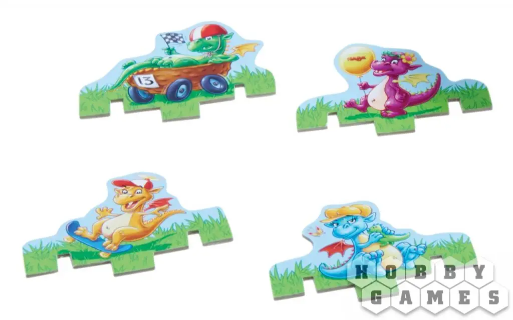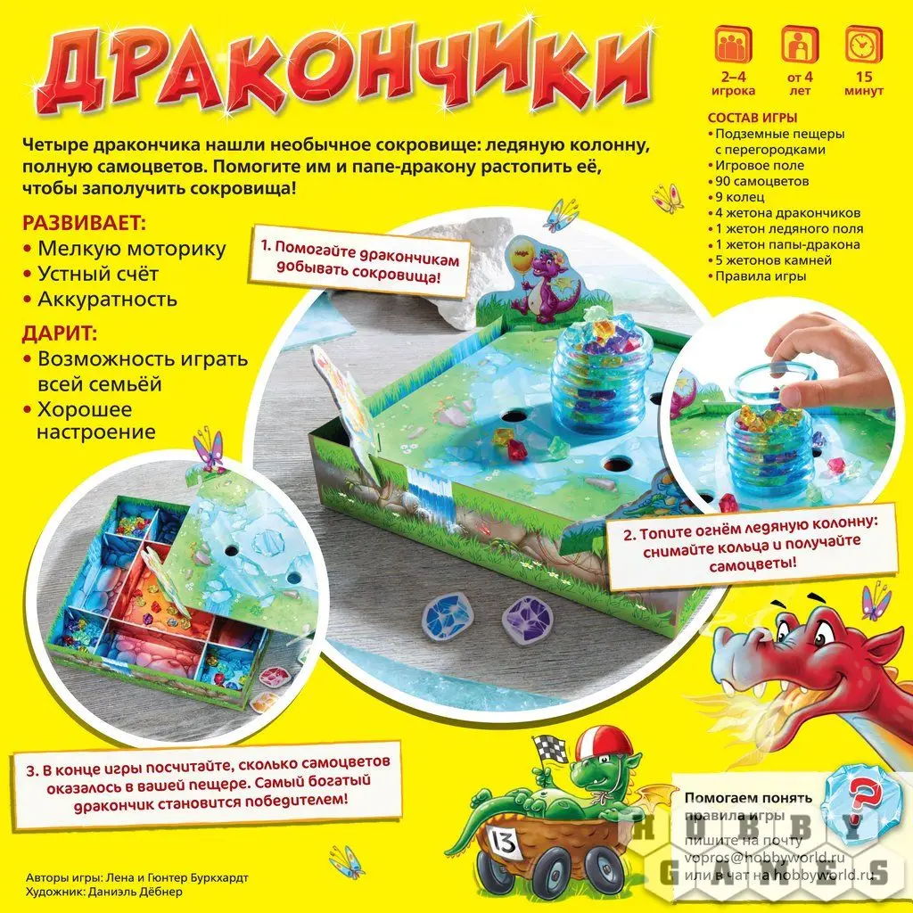 В комплекте вы найдёте игровое поле с прорезями, под которым будут находиться пещеры дракончиков и папы-дракона, специальную башню, которая состоит из девяти колец, лежащих друг на друге, и драгоценные камни пяти цветов, которые эту башню наполняют.