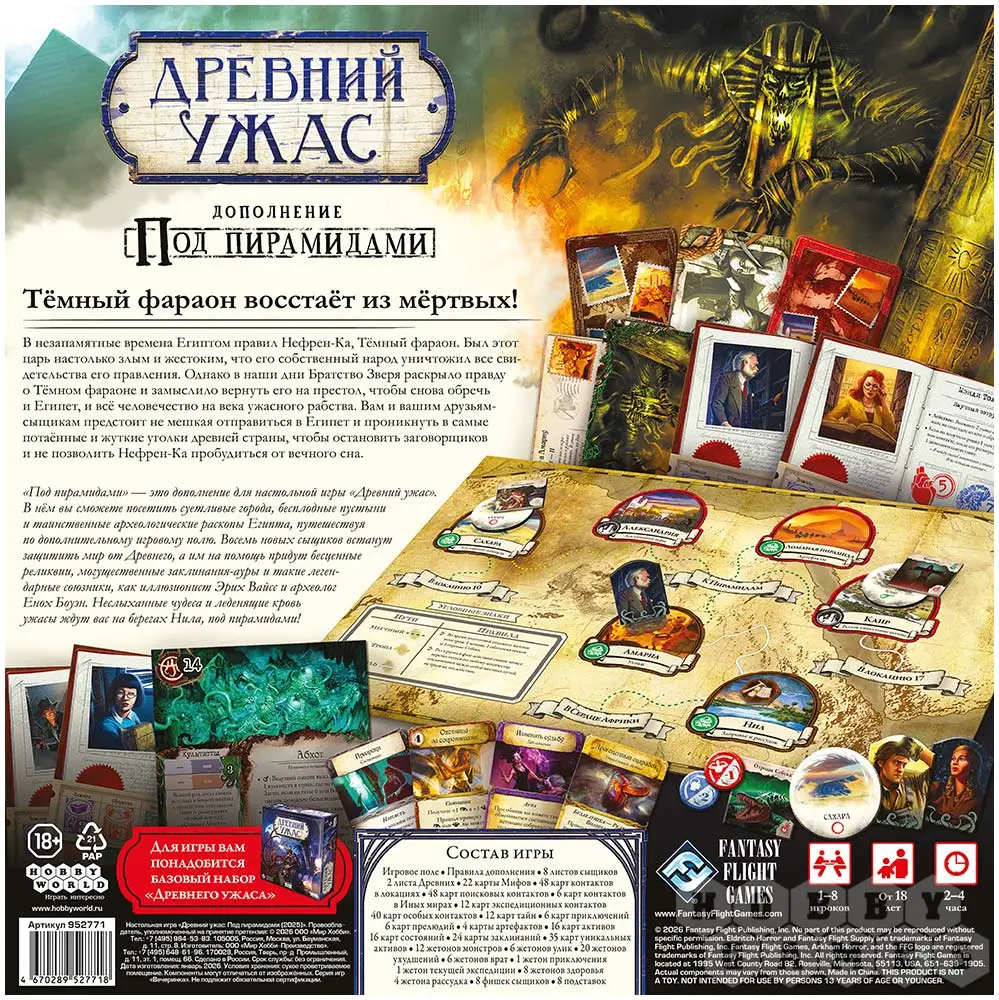 "Под пирамидами" – это дополнение для настольной игры "Древний ужас". В нём вы сможете посетить суетливые города, бесплодные пустыни и таинственные археологические раскопы Египта, путешествуя по дополнительному игровому полю. Восемь новых сыщиков встанут защитить мир от Древнего, а им на помощь придут бесценные реликвии, могущественные заклинания-ауры и такие легендарные союзники, как иллюзионист Эрих Вайсс и археолог Енох Боуэн. Неслыханные чудеса и леденящие кровь ужасы ждут вас на берегах Нила, под пирамидами!