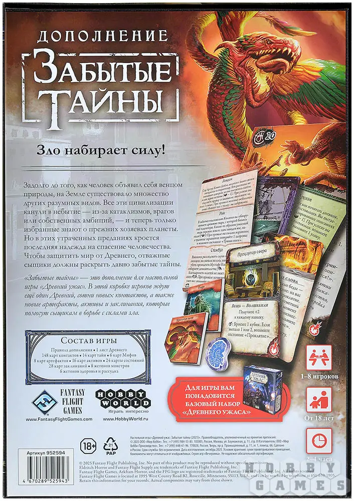 Древние выходят в открытое наступление, и только бесстрашные сыщики могут остановить надвигающееся зло. Путешествуйте по городам, закрывайте порталы, сражайте жутких тварей из других тёмных миров. "Забытые Тайны" – это дополнение для известной игры "Древний Ужас", которое не оставит равнодушным ни одного любителя произведений Лавкрафта. В забытых преданиях скрывается последняя надежда на спасение человечества. Но успеют ли сыщики раскрыть давно забытые тайны?..
