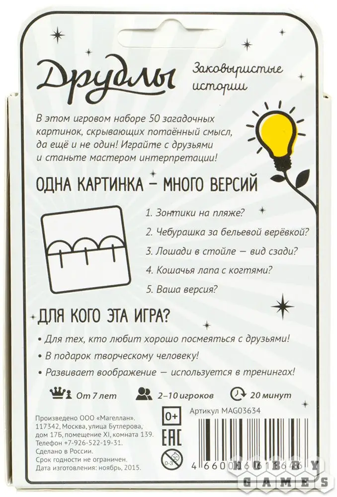 Правила простые, на середину стола выкладывается карточка и все игроки по очереди придумывают, что на ней изображено, карту забирает тот, кто последний выдвинет версию, а остальные игроки скажут пас. Но учтите, по просьбе других игроков, вам необходимо будет обосновать то, что вы увидели на карте.