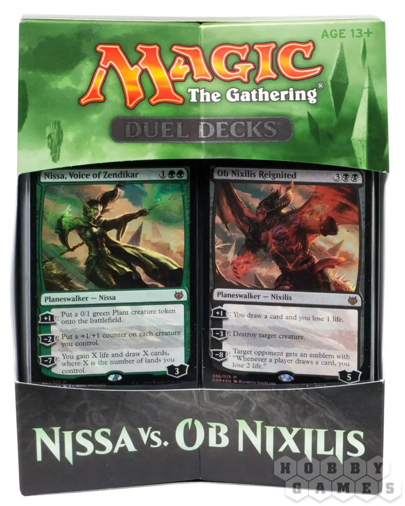 С помощью двух колод этого дуэльного набора вы сможете разыграть эпическое противостояние между защитницей Зендикара Ниссой и его потенциальным разрушителем Об Никсилисом. Готовые к игре шестидесятикарточные колоды включают в себя карты из различных выпусков Magic, в том числе две премиумные карты Planeswalker'ов с альтернативными изображениями и еще четыре карты с новыми артами (Ambition's Cost, Doom Blade, Crop Rotationand Wood Elves).