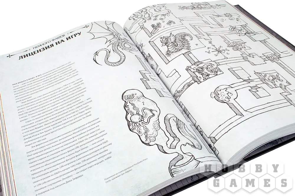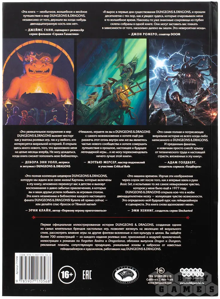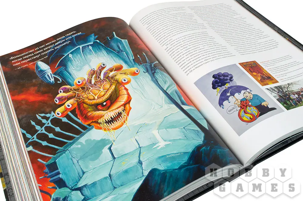 Под твёрдым переплётом этой красочно и качественно оформленной книги – более семи сотен иллюстраций, многие из которых полностью эксклюзивны: вы не найдёте их в интернете или печатных изданиях, а чтобы их получить, авторам книги пришлось ознакомиться с большим объёмом личных коллекций и архивов тематических журналов. Среди уникальных материалов – иллюстрации из каждого издания D&D и романов по мотивам игры, рекламные плакаты, концепт-арты и комментарии создателей игр и других художественных произведений по вселенной ролевой. В создании книги участвовали знаменитости, отличающиеся горячей любовью к Dungeons & Dragons: Майкл Уитвер, Кайл Ньюман, Джон Питерсон, Джо Манганьелло и многие другие.