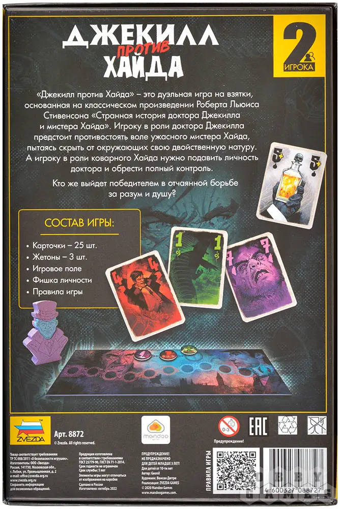 "Джекилл против Хайда" – это дуэльная настольная игра, в которой игроки вступят в противостояние, взяв на себя роли самого доктора Джекилла и его второй личности мистера Хайда. Игрок за доктора должен всеми силами противостоять воли мистера Хайда, чтобы сохранить в тайне от окружающих свою двойственную натуру, а мистер Хайд в свою очередь должен сделать всё, чтобы одолеть доктора и подавить его личность.
