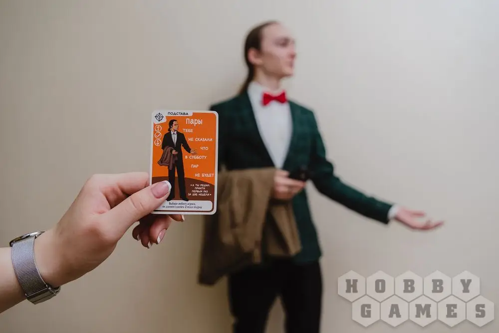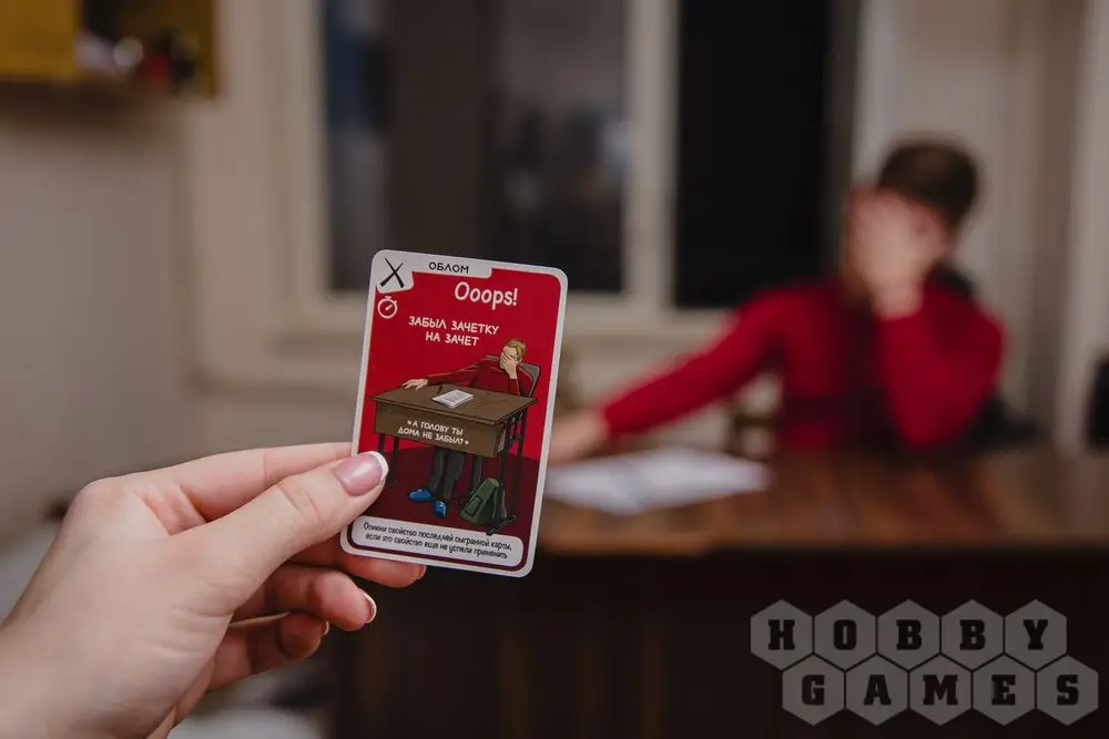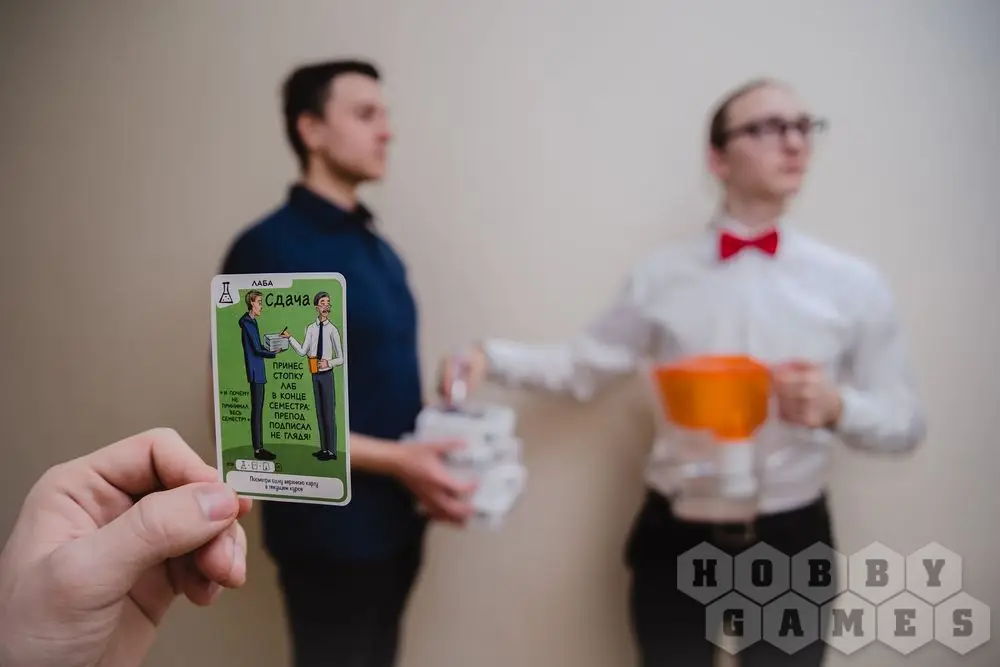 Выглядит это так: колода карт делится на 4 стопки - это "курсы". В первый "курс" замешивается три карты "Отчисления". Всем придется брать карты из этих стопок, и рано или поздно среди них попадется "Отчисление". Тот, кто вытянет больше всех к концу игры - проиграет!