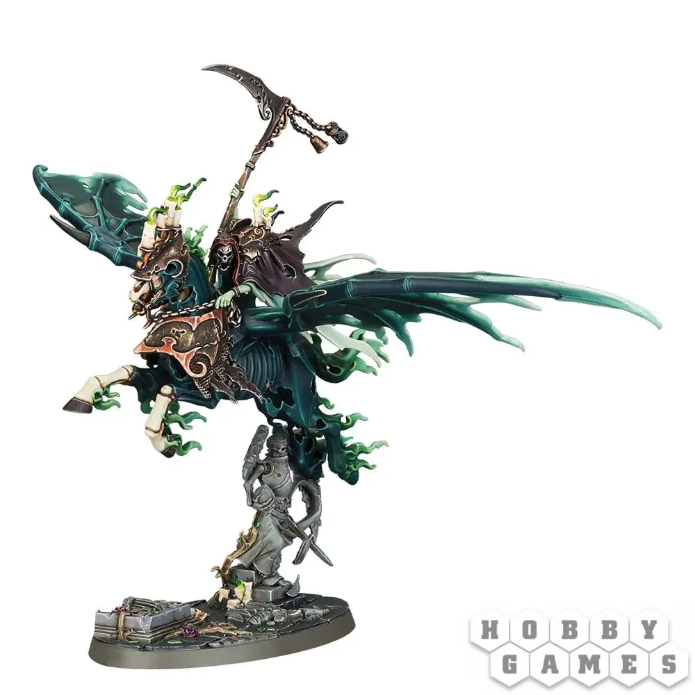Эта модель упрощенной сборки не требует клея и подойдет как новичкам, так и опытным игрокам. Литники выполнены из бирюзового пластика и не уступают в детализации обычным моделям. Этот многокомпонентный пластиковый набор содержит детали, необходимые для сборки Рейкенора Зовущего Смерть (Reikenor the Grimhailer), впечатляюще агрессивной и зловещей миниатюры из серии Nighthaunt. В своей эфирной форме всадник облачен в потрепанную мантию, из под которой виднеется череполикая маска и тонкие руки, удерживающие оружие – ужасающе огромную косу, увенчанную могильными песочными часами на цепочке, и поводья скакуна – крылатого кошмара по имени Кьялларон (Kyallaron). Он представляет собой великолепное зрелище, хоть и является нежитью – большие потрепанные крылья произрастают из спины, его сила очевидна, хоть и из боков торчат ребра, а ноги лишены плоти. Стальной шлем скакуна, как и доспех наездника,венчают несколько призрачных свечей. Миниатюра изображена низко парящей над кладбищенским ландшафтом, а зловещая крылатая статуя мертвеца соединяет её с базой.