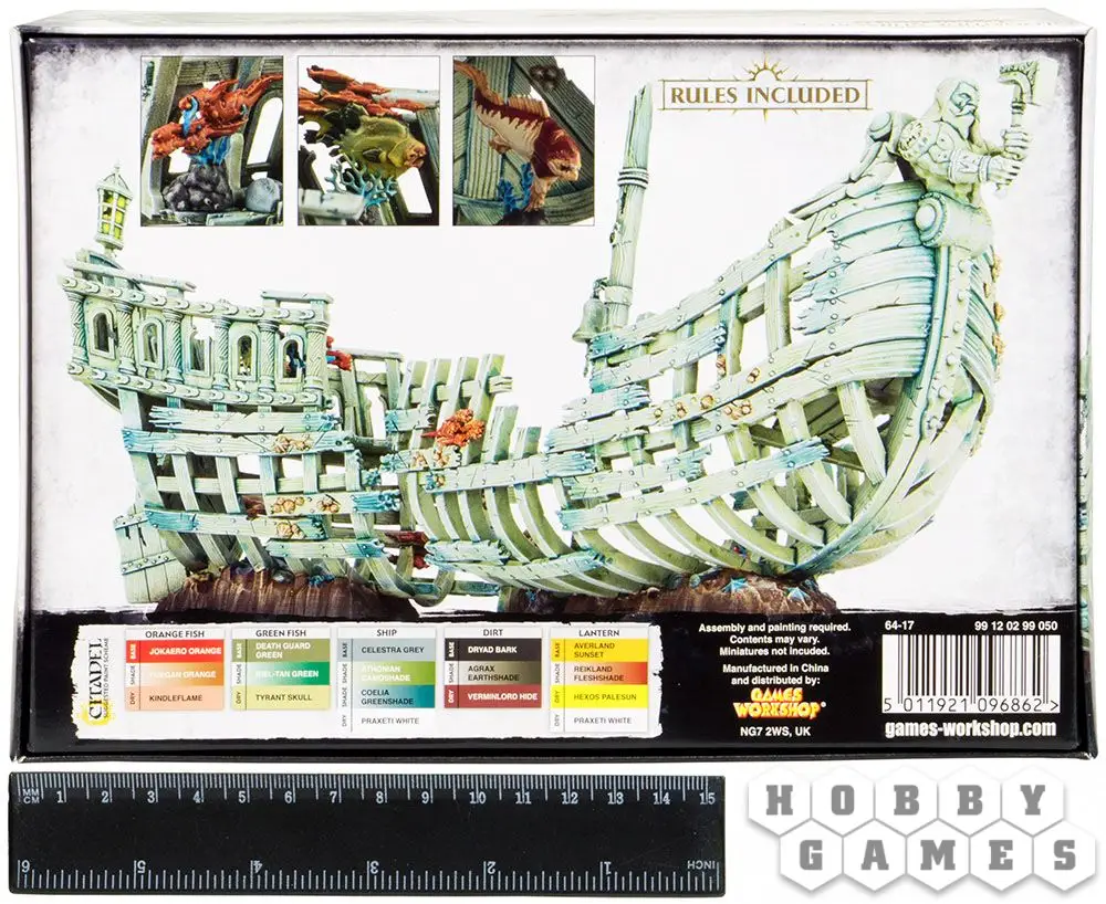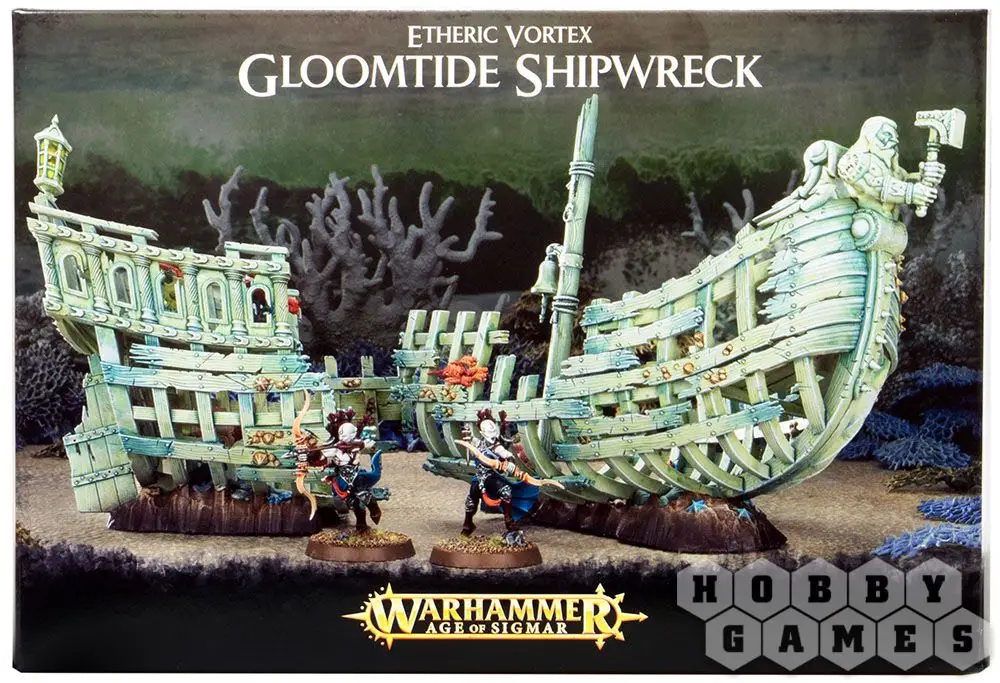 Этот многокомпонентный пластиковый набор содержит детали, необходимые для сборки элемента террейна серии Etheric Vortex – Gloomtide Shipwreck, старый разбитый корабль, который подойдет для использования с армией Глубиннорожденных Идонета (Idoneth Deepkin). Модель представляет собой разрушенный морем остов, каркас давно забытого морского судна, ставшего обителью планктона, кораллов и эфирных существ, служащих Идонету. Корабль состоит из двух частей, которые можно поставить отдельно на игровом столе или же вместе, образуя тем самым цельный корпус. Поверхность корабля покрывают наросты из кораллов и планктона, останки костей и различные предметы, такие как развалившийся руль, фонарь, колокол и сломанный секстант. Различные сигмаритовые элементы интерьера корабля напоминают о былых временах — носовое украшение в виде фигуры с молотом в руках, раздвоенная комета на мачте и мемориальная табличка сзади. Также в набор включены 6 косяков морских обитателей — их можно использовать в оформлении затонувшего корабля на ваш вкус, или же украсить ими подставки любых миниатюр Глубиннорожденных Идонета (Idoneth Deepkin).