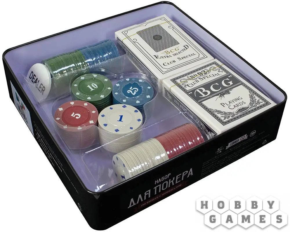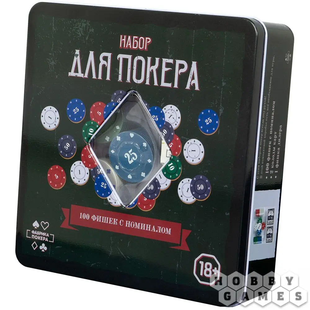 Фабрика Покера: Набор из 100 фишек с номиналом для покера в жестяной коробке