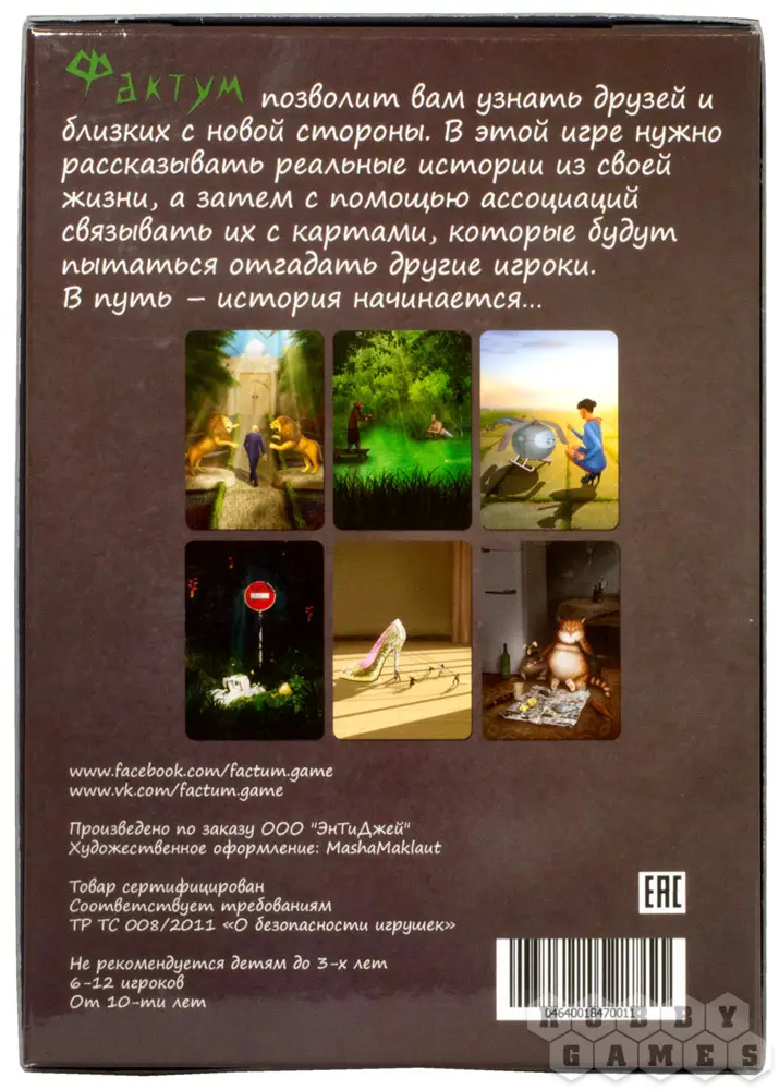 С помощью настольной игры «Фактум» вы сможете узнать своих родных и знакомых гораздо лучше, а иногда даже с новых и неожиданных сторон. В этой игре вам необходимо делиться настоящими, непридуманными историями из своей жизни, а после этого, опираясь на ассоциативные ряды, связывать их с картами, на которых изображены причудливые картины. Отгадать эти карты — задача противоположной команды.