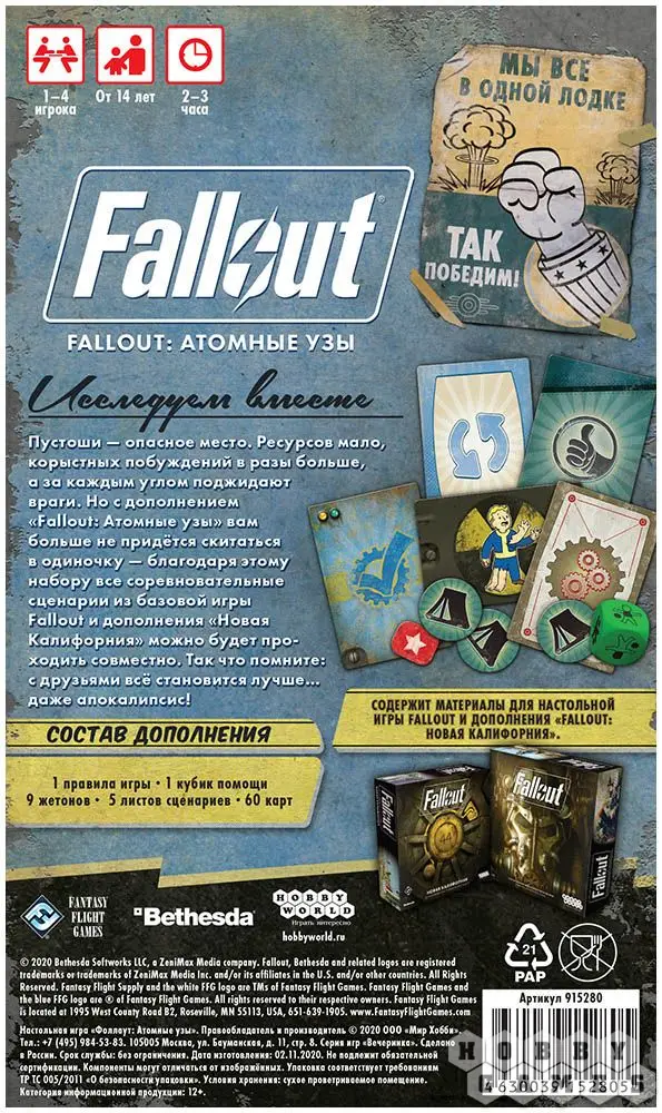 "Атомные узы" – набор к настольной игре Fallout и дополнению "Новая Калифорния”, который позволяет проходить все сценарии в кооперативном режиме, объединяя всех общей целью. Это дополнение также добавляет особые механики, от которых игроки получат новый игровой опыт. Предметы и оружие теперь можно модифицировать, полученная радиация может вызвать мутации, которые могут оказаться как полезными, так и вредоносными, а кубик помощи позволит вам помогать другим игрокам во время боя.