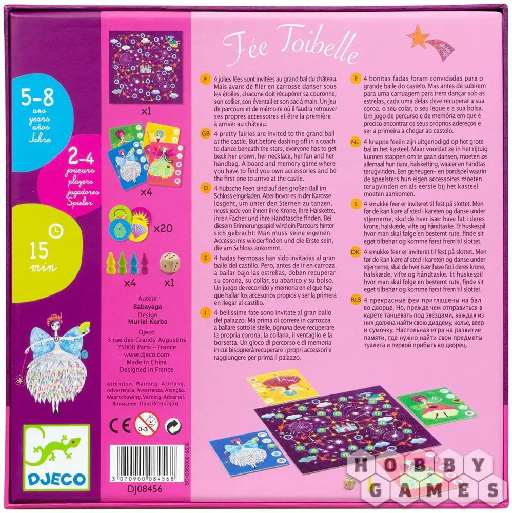 Игра-бродилка Fee Toibelle порадует маленьких фей. В ней нужно первой добраться на бал в замке, добыть по пути необходимые аксессуары к платью и найти карету. В коробке с игрой вы найдёте игровое поле, по которому предстоит передвигаться, жетоны аксессуаров и карет, карточки и фишки для фей и игральный кубик. Перед началом партии каждая участница выбирает себе фею, за которую будет играть, а на игровом поле раскладываются жетончики.