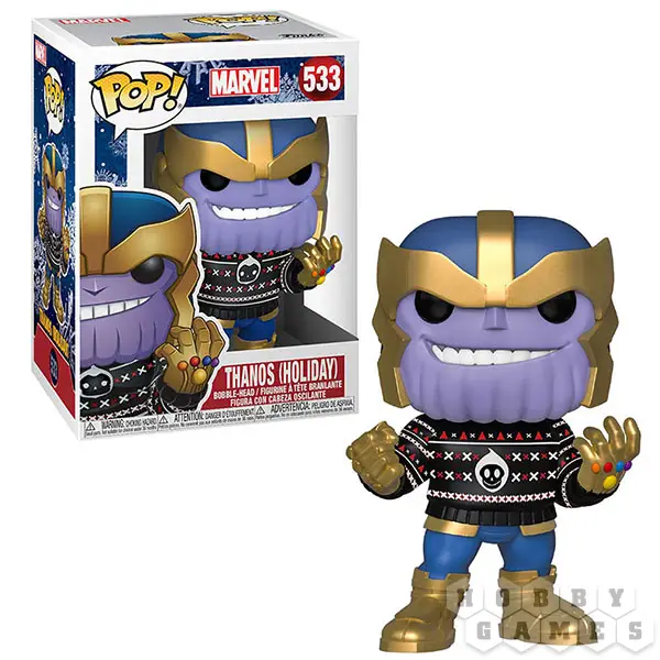 Фигурка Funko POP! Bobble: Marvel: Holiday: Thanos- эксклюзивная фигурка к Рождественским и новогодним праздникам. Как вы думаете празднуют ли супергерои праздники? Конечно же, да! Встречайте любимых героев в веселых и забавных образах и костюмах. Даже суперзлодеи любят праздники и забавные свитера.