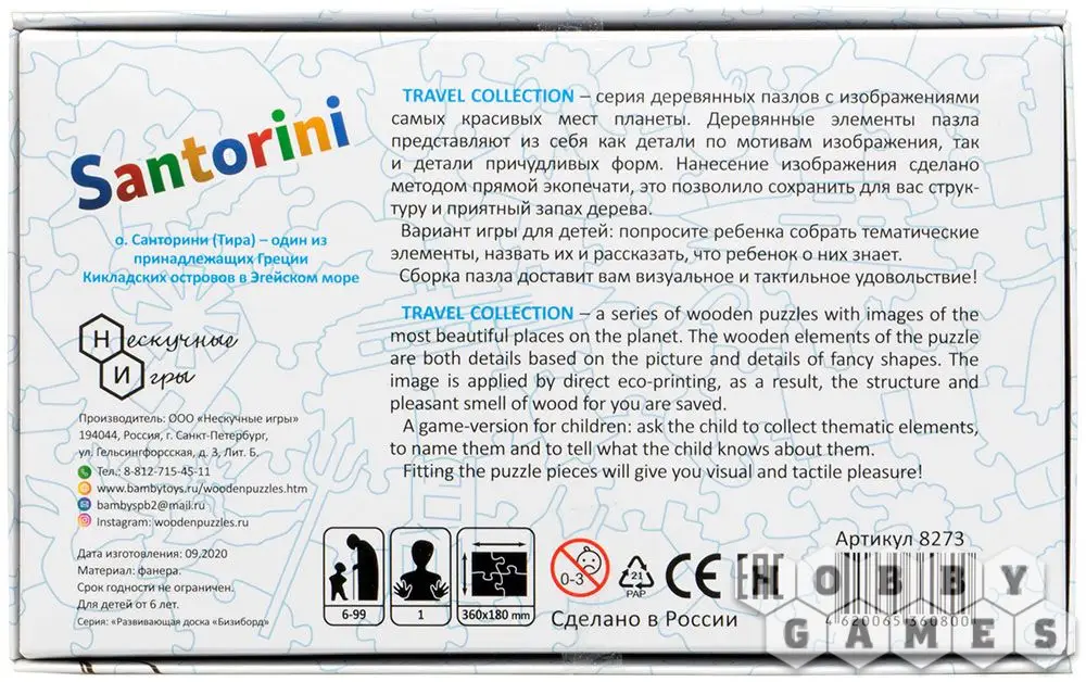 В небольшой коробке из серии Travel Collection вы найдёте деревянные элементы, складывающиеся в изображение одной из достопримечательностей мира. Это уникальные пазлы, которые сохраняют естественный запах дерева, сделаны методом прямой экопечати. Фигурные детали делают процесс игры интереснее, так как они, несмотря на то, что являются частью целого, становятся самодостаточными элементами, которые любопытно разглядывать по отдельности.