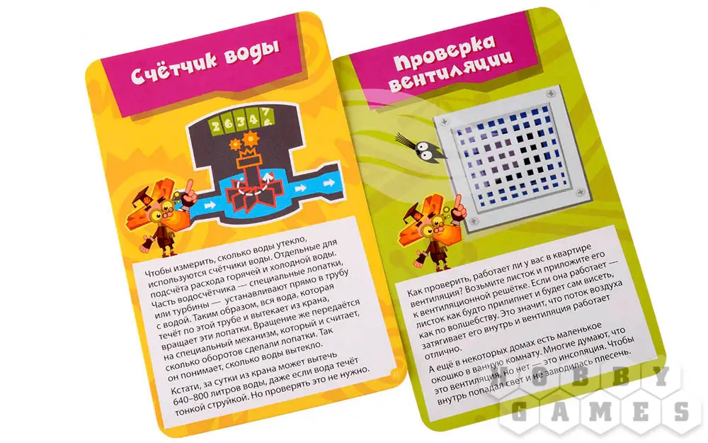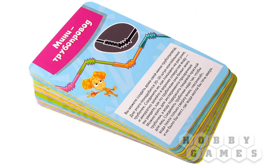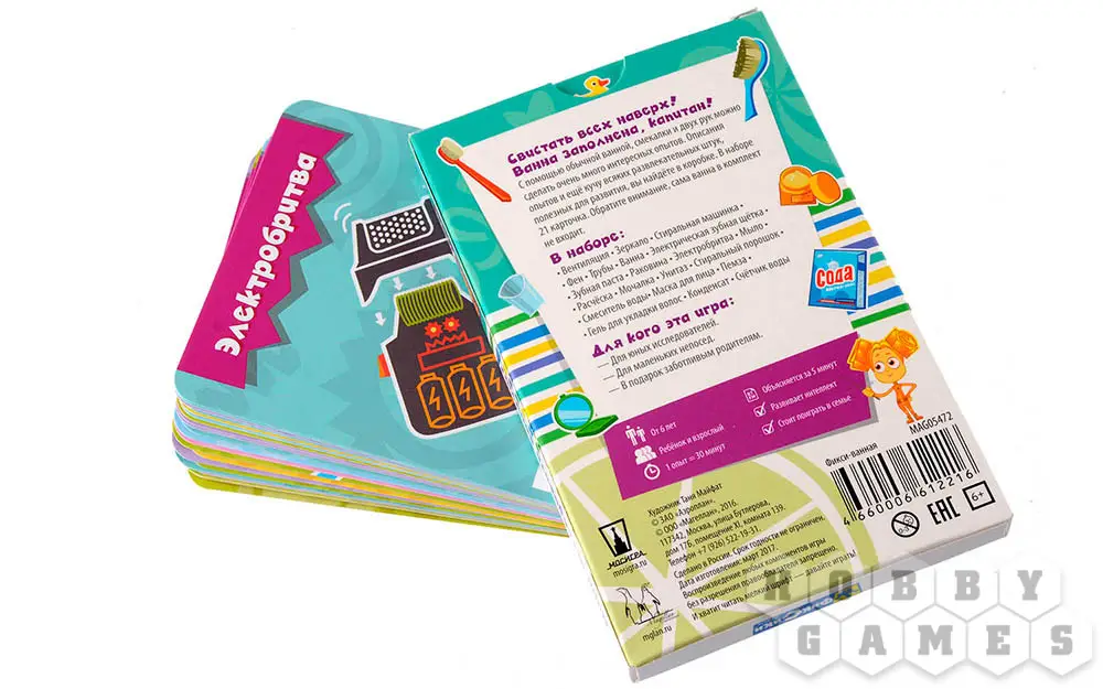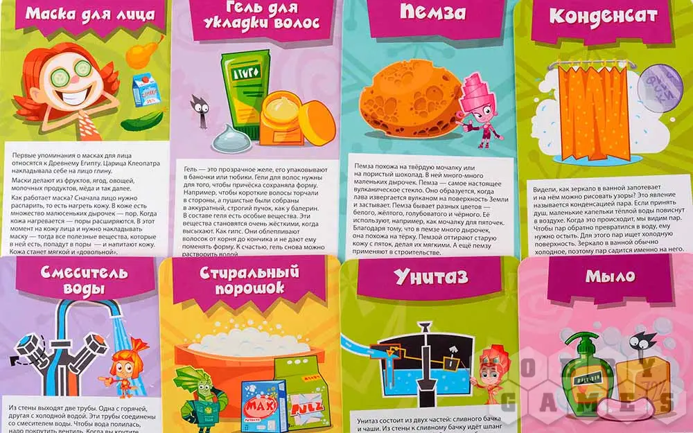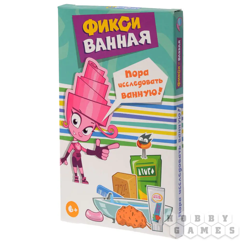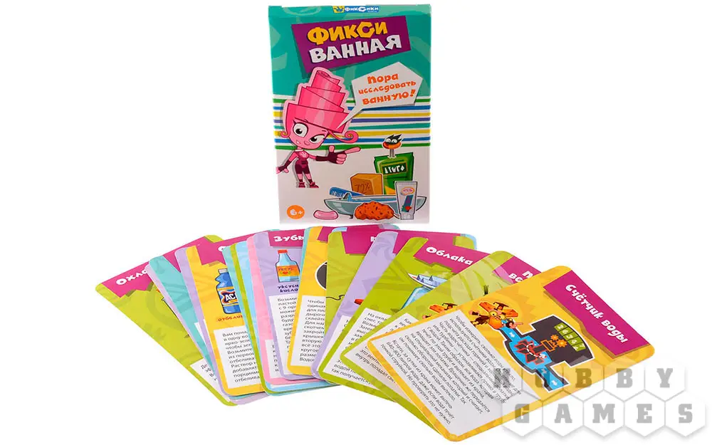 В коробочке с настольной игрой "Фикси-ванная" вы найдёте 21 карточку с описанием различных вещей, предметов и бытовых приборов, которые обычно "живут" в ванной комнате. Из красочных карточек с любимыми мультгероями дети узнают, например, как устроена электрическая зубная щётка, как работает вентиляция, и что такое смеситель воды.