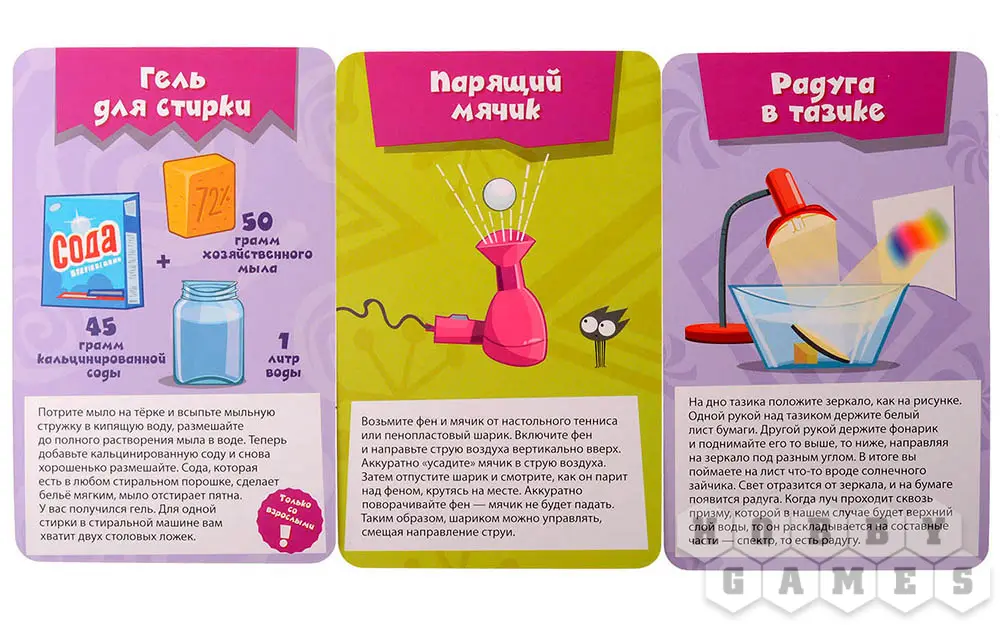 Также игра предлагает взрослым и детям провести вместе несколько полезных и познавательных опытов. Создайте собственный водоворот при помощи двух пластиковых бутылок, удержите воду внутри перевёрнутого стакана, заставьте мячик от пинг-понга парить в воздухе, понаблюдайте за "танцующими" красками. Все эксперименты абсолютно безопасны и наверняка придутся по вкусу юным пытливым умам!
