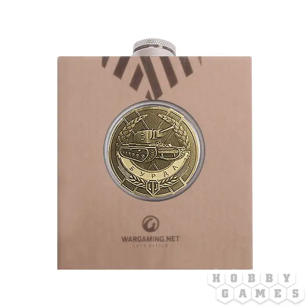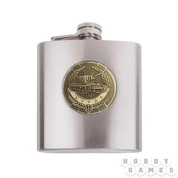 Стальная фляжка с оригинальным дизайном, украшенная изображением награды и достижения World of Tanks.
