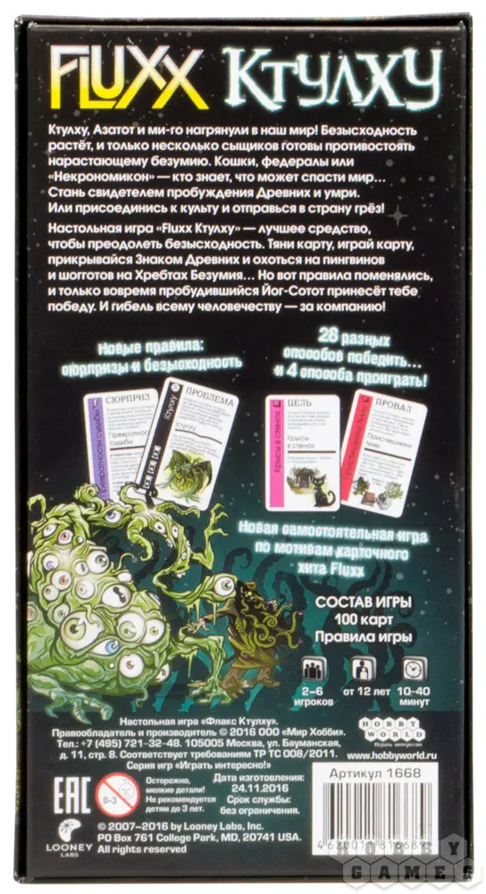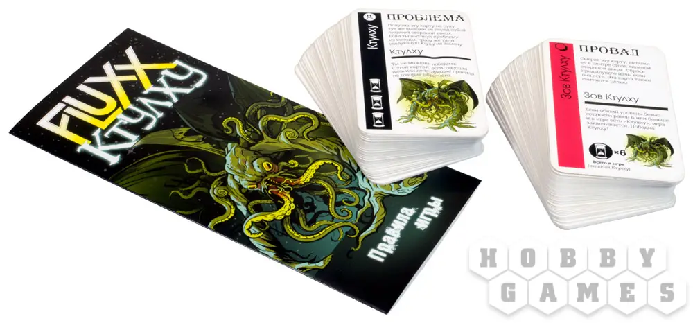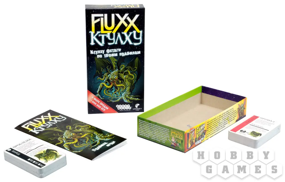 Настольная игра "Fluxx: Ктулху" – лучший способ ощутить новые грани безысходности и одолеть её. Тянем карту, играем карту, охотимся на шогготов среди Хребтов безумия и творим Знаки Древних… Но помните, Fluxx – игра об изменениях, а ничто не изменчиво так, как Древние Боги, их гнев и благосклонность!