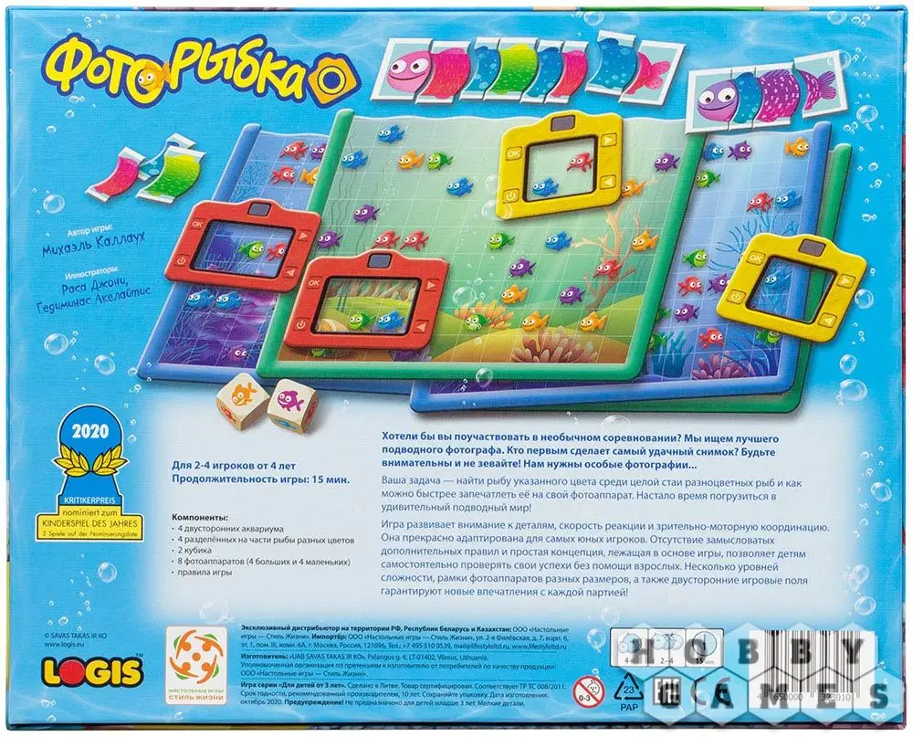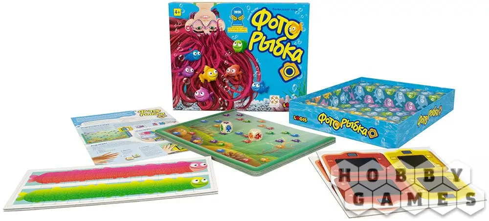 "Фоторыбка" – это детская настольная игра на развитие внимания для 2-4 участников, где игроки сначала пытаются сфотографировать рыбок таких цветов, какие выпали на кубиках, а потом собрать из разноцветных частей самую длинную рыбу. Поучаствовать в подводной фотоохоте смогут маленькие игроки аж с 4 лет – только самых маленьких лучше сажать с зелёной стороны аквариума, она попроще. А более опытным игрокам лучше сесть за синюю сторону.