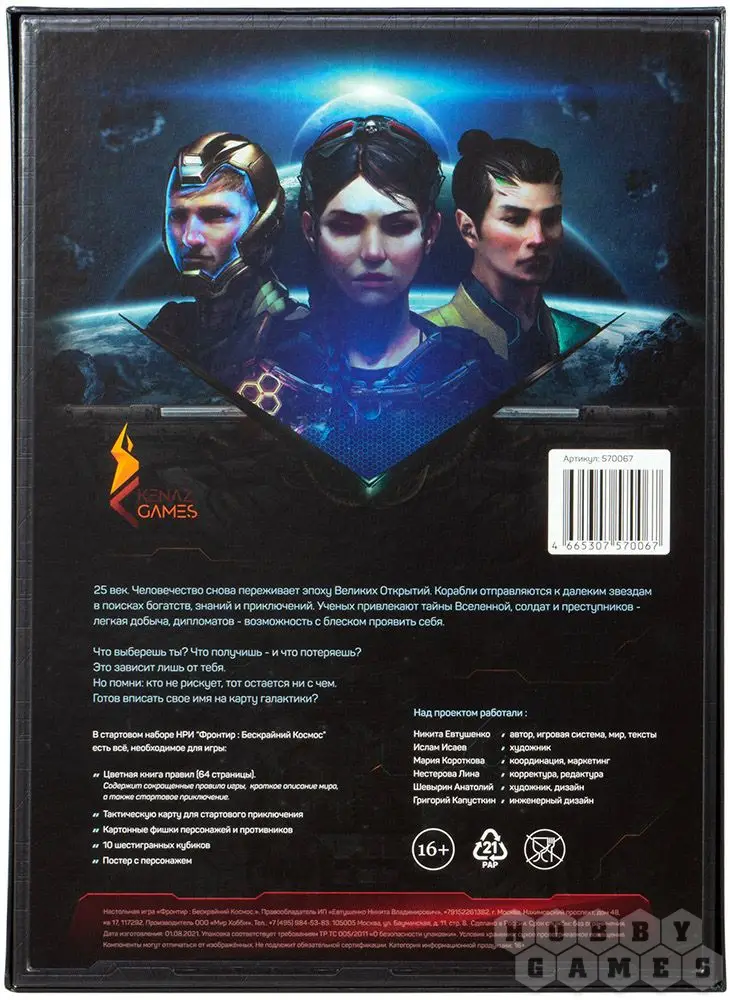 "Фронтир: Бескрайний космос" – это настольная ролевая игра, разработанная Kenaz Games по мотивам варгейма с миниатюрами "Фронтир: Далёкие звёзды". Ролевая система основана на механиках "Точки отсчёта", уже знакомых по "Кориолису", "Чужому" или "Мутантам", однако дополнена своими интересными особенностями, например, системой биомодификаций персонажа. Игрокам предстоит взять на себя роль экипажа космического корабля и отправиться на край изведанной Вселенной. В стартовый набор вошло всё необходимое для игры: правила, кубики, фишки и другие игровые аксессуары. Напишите свою собственную историю в фантастическом мире "Фронтира" – звёзды ждут вас!