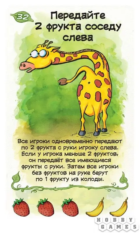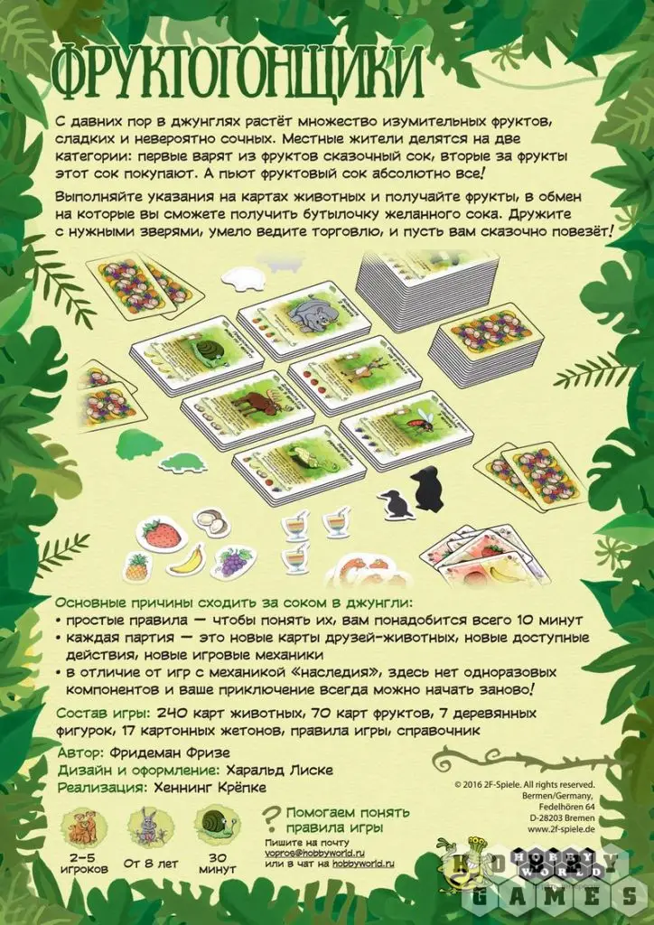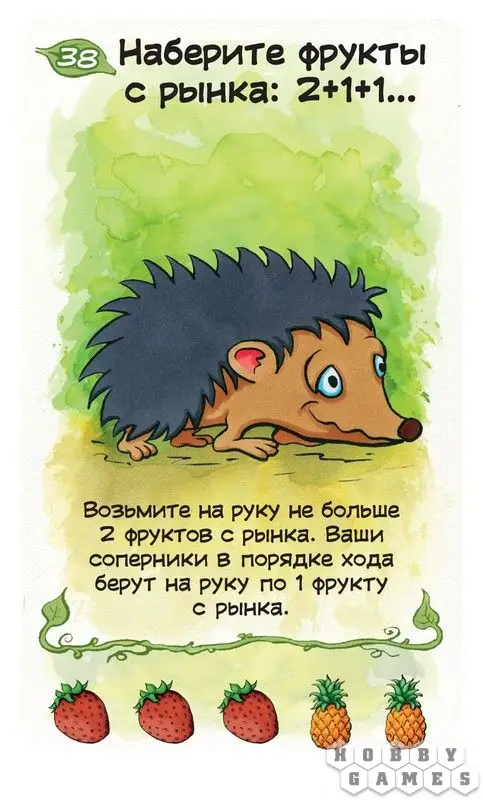 Ох, какие сочные и вкусные фрукты. Ну кто же их не любит? Вот и животные из сказочного леса обожают фрукты, а ещё больше любят варить из них сок. Без сока никто из местных жителей даже из дома не выходит. Ходите в гости по утрам к другим животным и обменивайте фрукты на сок. Почему по утрам? Первый гость получает дополнительные фрукты за каждого последующего гостя. Дружите и торгуйте в настольной игре "Фруктогонщики".