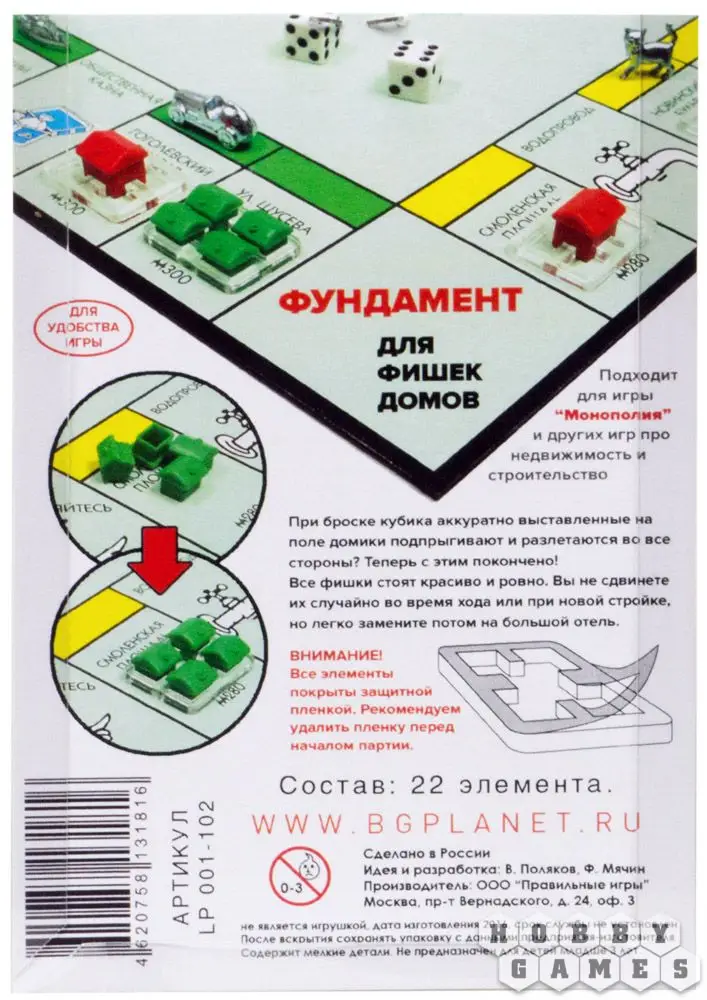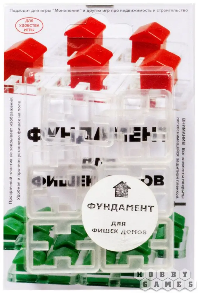 Подставки отлично подходит для игры в "Монополию" и аналогичные настолки про недвижимость и строительство. При броске кубика на поле домики больше не будут подпрыгивать и разлетаться во все стороны. На фундаменте домики стоят ровно и надежно. Вы не сдвинете их случайно на соседнее поле и легко сможете заменить на большой дом.