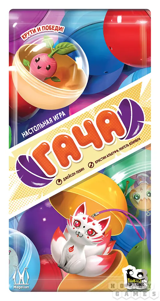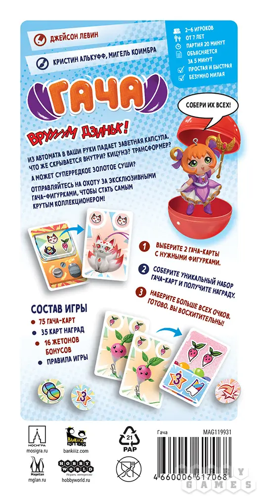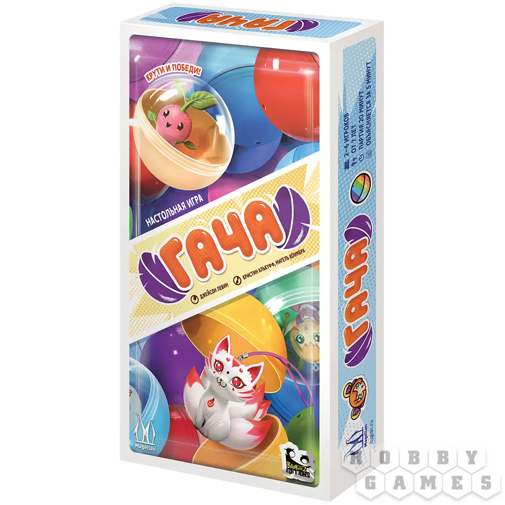 В настольной карточной игре "Гача" вы станете коллекционерами одноимённых игрушек! Какая фигурка вам достанется из аппарата: будет ли это трансформер или кицунэ? А может быть вам попадётся очень редкое позолоченное суши? Как бы то ни было, постарайтесь собрать наиболее ценную коллекцию фигурок и получите за неё наибольшее количество очков!