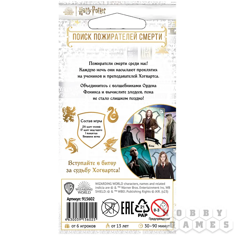 "Гарри Поттер: Поиск пожирателей смерти" – это социальная настольная игра, в основе которой лежит всемирно известная "мафия". В зависимости от того, какая выпадет роль, вам придётся либо задействовать дедуктивные навыки, либо стараться запутать оппонентов с помощью хитрости. Чем больше компания, тем больше в игре будет разнообразных персонажей – собирайте друзей и родственников, магическое веселье обеспечено!