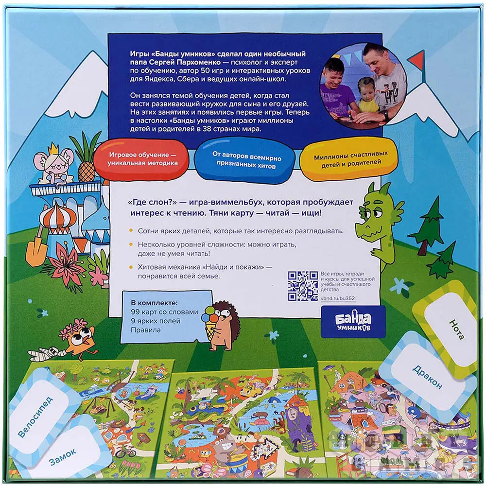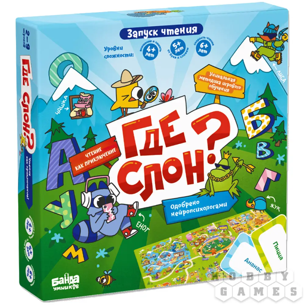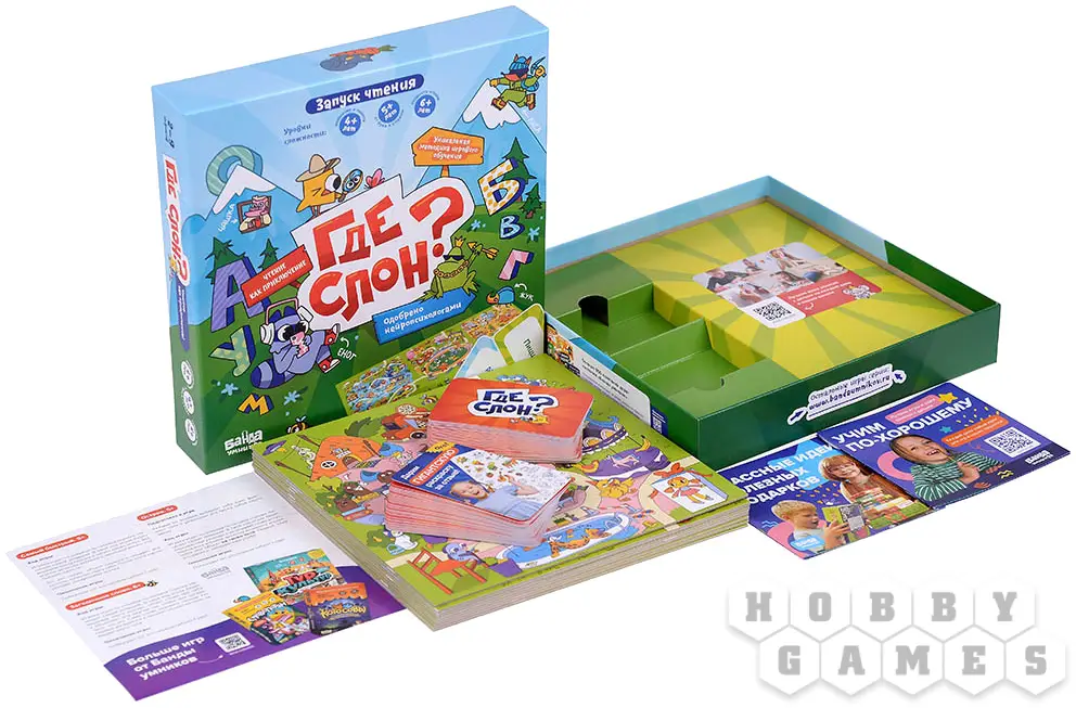 Книга – всему голова! А совсем малыши могут начать не с книжек, всё-таки это дело для них пока слишком сложное, а с карточек – этого вполне достаточно для того, чтобы практиковать и развивать навыки чтения. Карточная игра для самых маленьких "Где слон?" как раз для этого и создана.