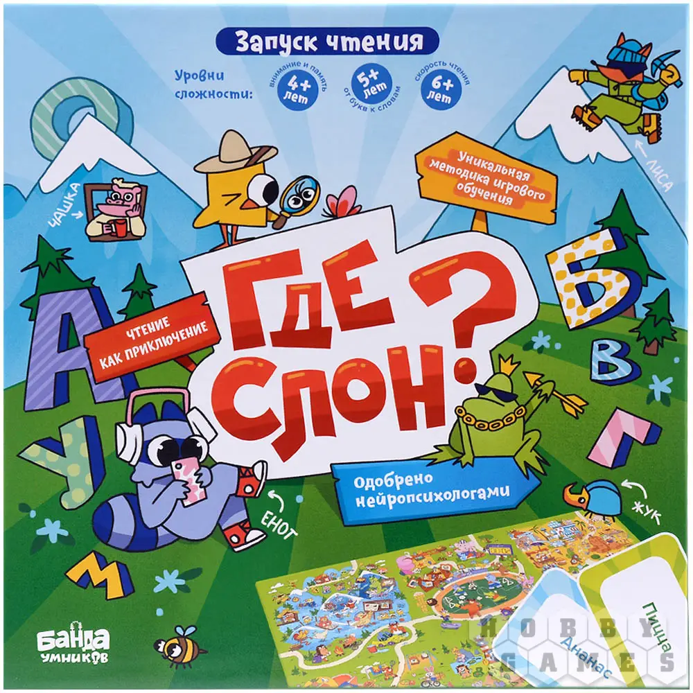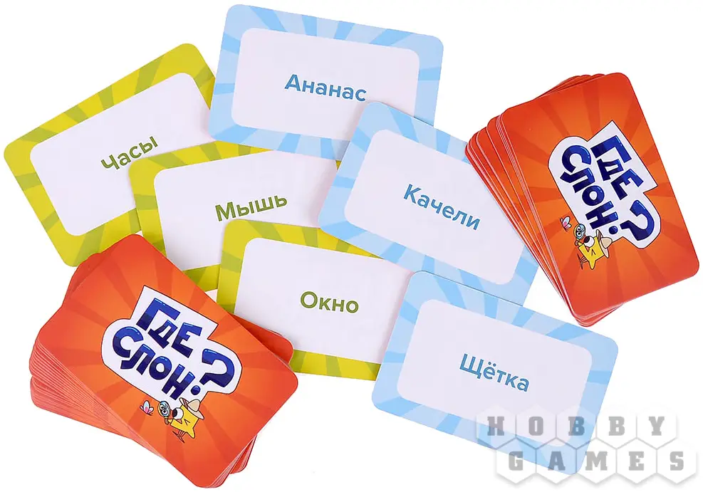 Суть игры в том, чтобы вытянуть карточку и прочитать слово, а потом найти его на разноцветном поле и указать на него пальцем. В раунде побеждает тот, кто нашёл нужный объект первым и забрал себе карточку, а в игре – тот, кто первым собрал 7 карт! Детишки могут играть в неё как самостоятельно, так и со взрослыми – в зависимости от их возраста. В игре существует несколько уровней сложности: короткие слова, длинные, а ещё не слова, а их объяснения – чтобы ребёнок сперва только сообразил, что ему нужно найти, и только потом нашёл. А ещё в "Где слон?" много многозначных слов, что развивает ассоциативные способности и помогает увеличить словарный запас! В общем, отличный вариант для самых маленьких.