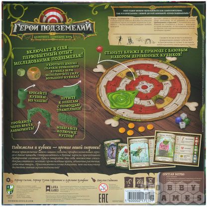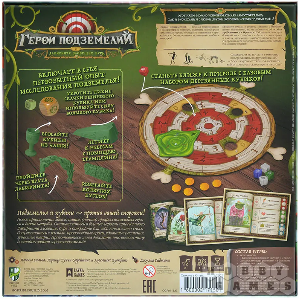 "Герои подземелий в Лабиринте зловещих бурь" – это весёлое и непредсказуемое приключение, в котором вам предстоит делать всё по канонам РПГ в жанре фэнтези: исследовать подземелье, сражаться с монстрами, прокачивать героя и в конце покрошить на тысячу кусочков финального босса. Но забудьте о привычных механиках, а точнее о простых бросках кубиков. Нет, вам всё ещё предстоит их делать, только не так, как вы привыкли: встаньте из-за стола, отойдите на метр и киньте! Или развернитесь к столу спиной и попробуйте попасть в поле-мишень. Как именно полетят кубы, продиктуют вам карты, а вы приложите все усилия, чтобы попасть точно в цель!