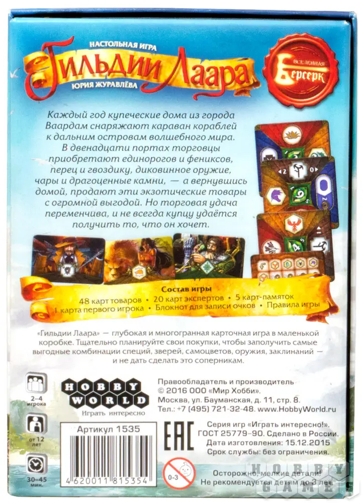 «Гильдии Лаара» — многогранная, глубокая карточная игра, умещающаяся в компактной, удобной упаковке. Тщательно продумывайте планы покупок, чтобы получить наиболее выгодные комбинации зверей, самоцветов, специй, заклинаний и оружия. И не забывайте - соперники будут стремиться сделать то же самое!