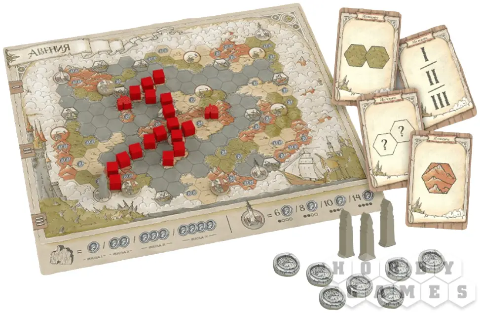 В настольной игре "Гильдия купцов-путешественников" вы будете покорять различные территории, от южных до северных, от пустынь до отвесных скал, и прокладывать выгодные торговые маршруты, открывая новые поселения и выполняя миссии. Всё – ради того, чтобы набрать как можно больше победных очков, то есть монет, и превознести славу и величие королевы Гикупу. На то, чтобы выделиться среди соперников и победить, у вас будет ровно 4 раунда. Успеете ли вы разжиться богатством и покорить её Величество своей самоотверженностью?