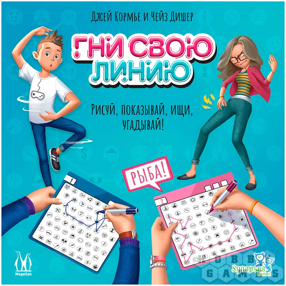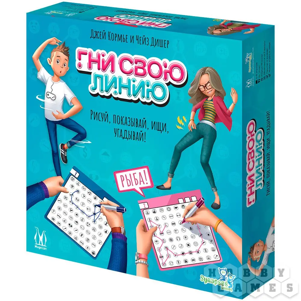 Настольная игра "Гни свою линию" полна веселья и творческого подхода! В ней принимают участие от 2 до 4 команд по 2 человека. Один из членов команды – художник – вытягивает карту и рисует на своём планшете тайное слово, соединяя по порядку разные значки. После этого звуками и жестами он объясняет своему напарнику, какие значки тот должен соединить на своём планшете, чтобы получился такой же рисунок. Та команда, игрок которой первым назовёт загаданное слово, побеждает.