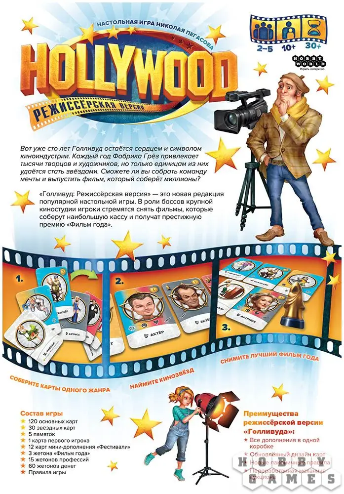 "Голливуд: Режиссёрская версия" – это новая редакция популярной настольной игры. В роли владельцев крупной киностудии от двух до пяти игроков пытаются снять фильмы, у которых по итогам проката будут наибольшие сборы. Эти картины в результате станут лауреатами престижной премии.