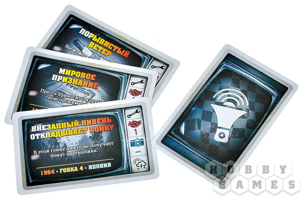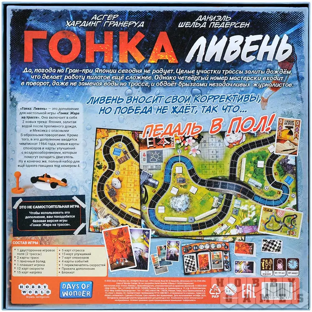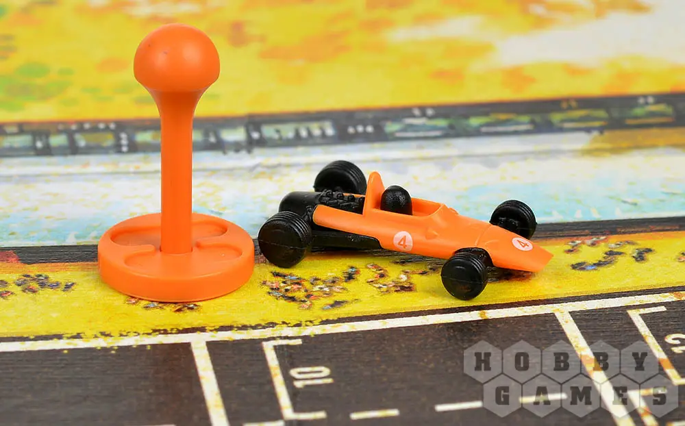 В настольной игре "Гонка: Жара на трассе" вас ждёт скорость, скорость и ещё раз скорость! Перенеситесь в мир автоспорта 60-х годов, сядьте за руль собственного болида и станьте героем всех гоночных треков! Но помните, что "газ в пол" – не единственная стратегия, которой нужно придерживаться: хватит ли резины на ещё один занос? Не накроется ли перегретый двигатель в самый неподходящий момент? Да и хватит ли вам квалификации?