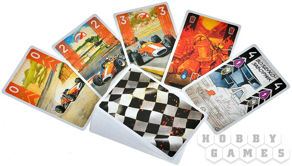 Выберите свой цвет и возьмите все компоненты этого цвета: болид, планшет игрока, переключатель скоростей, 12 карт скорости и 3 карты начальных улучшений. Дополнительно возьмите карты стресса и нагрева (их количество указано на карте трассы). Перемешайте полученные карты (кроме нагрева) и выложите составленную колоду в левую ячейку своего планшета, а карты нагрева в среднюю – это ячейка двигателя. Расположите болиды на игровом поле и возьмите из своей колоды 7 карт. Всё готово к гонке!