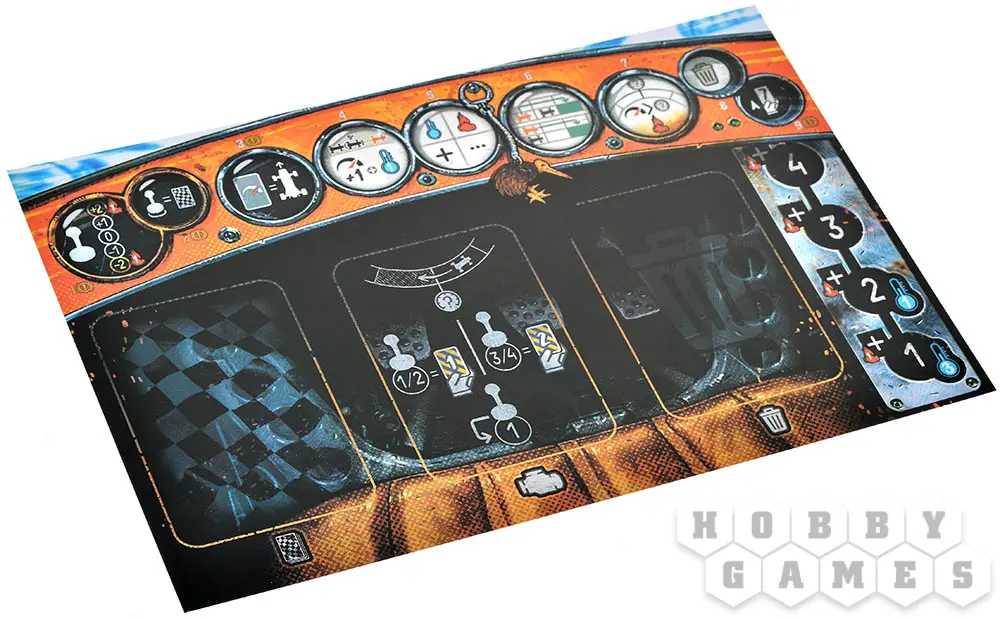 Этап 5. Реакция. На этом этапе вы применяете все доступные вам символы с разыгранных карт в любом порядке. Можете ускориться и переместиться на ещё одну клетку, но для этого придётся сбросить карту нагрева с ячейки двигателя. А ещё можно охладить двигатель! Для этого переложите карты нагрева с руки в соответствующую ячейку на своём планшете.