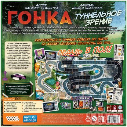 "Гонка: Туннельное зрение" – второе дополнение к игре "Гонка: Жара на трассе", добавляющее две новые трассы, вдохновлённые Гран-при Испании и Нидерландов. Оно вводит свежие механики – туннели и обновлённые условия прохождения поворотов. Появляются карты улучшения переднего крыла, события сезона и возможность играть вплоть до 7 участников (или 8 с дополнением "Ливень"). Дополнение идеально подходит тем, кто хочет повысить сложность и добавить в заезды больше напряжения и стратегической глубины!