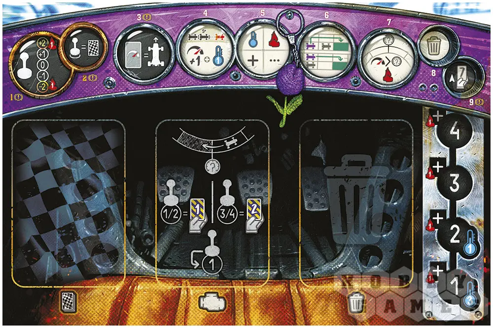 Этап 5. Реакция. На этом этапе вы применяете все доступные вам символы с разыгранных карт в любом порядке. Можете ускориться и переместиться на ещё одну клетку, но для этого придётся сбросить карту нагрева с ячейки двигателя. А ещё можно охладить двигатель! Для этого переложите карты нагрева с руки в соответствующую ячейку на своём планшете.