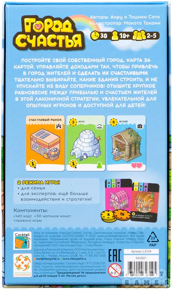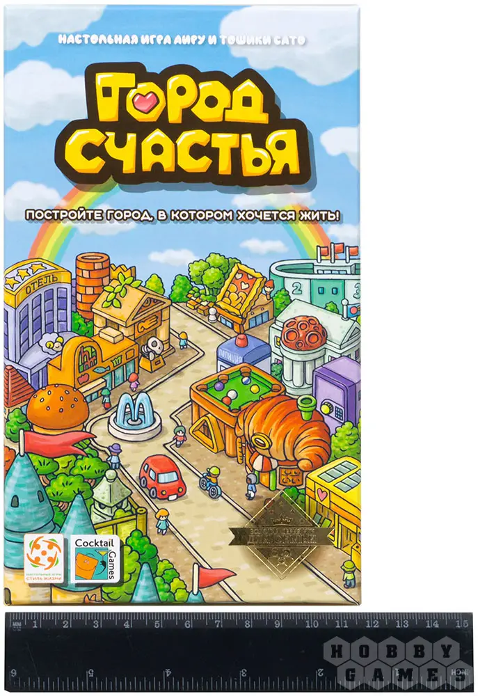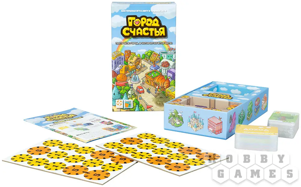 "Город счастья" – это компактная карточная игра, в которой игрокам предстоит посоревноваться в создании самого уютного города в мире. Эта несложная экономическая стратегия отлично подойдёт как для вечера в кругу семьи, так и для напряженного противостояния, благодаря разным режимам. Стройте здания, получайте доход и пусть ваш город счастья принесёт своим жителям много радости!